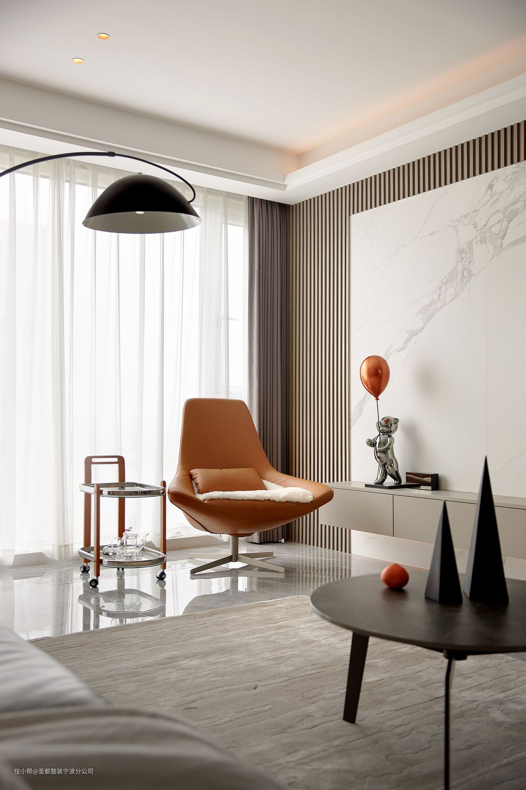 暖橙的单椅增添了客厅的慵懒与舒适,弧线形优雅舒展的钓鱼灯,成为空气中微甜的调味剂,回归家温馨的本质。