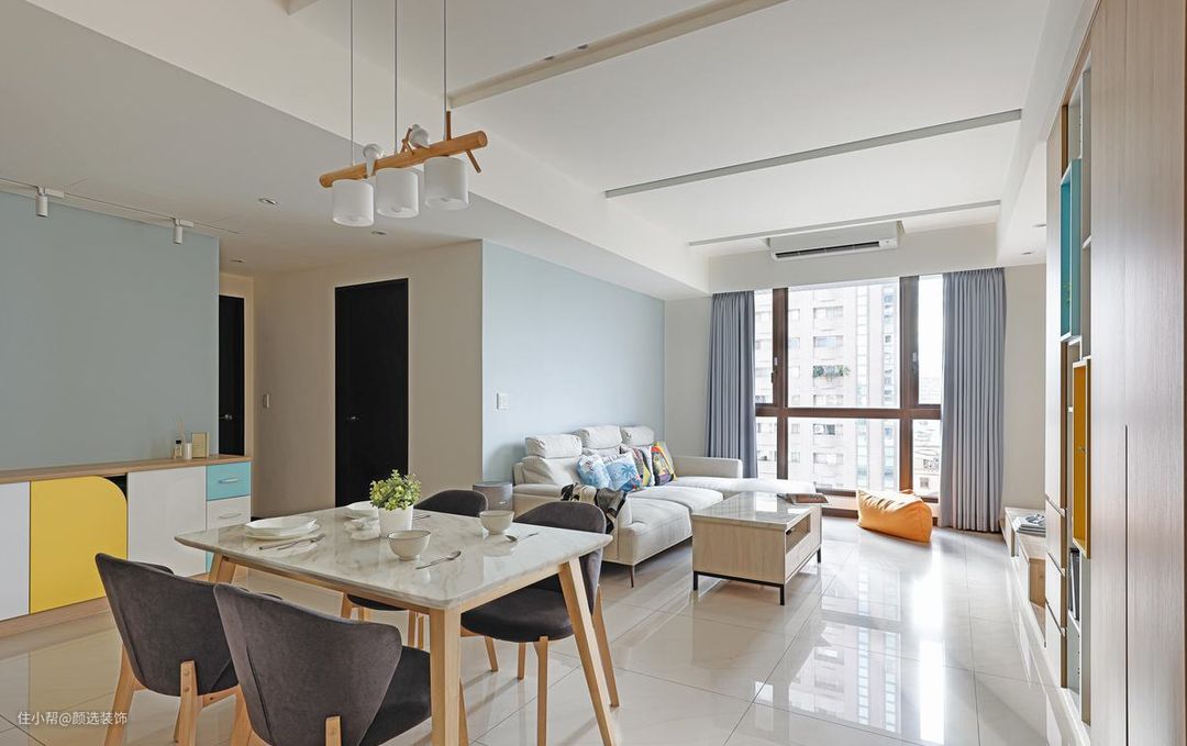 客厅大理石薄板砖铺排整面电视墙,放大了客厅尺度。搭配白、蓝、黄跳色柜体穿插在客餐厅中,与清爽的浅灰蓝沙发背墙相呼应,为舒适的北欧风空间,增添丰富青春色彩与层次感,构筑出家的新面貌。