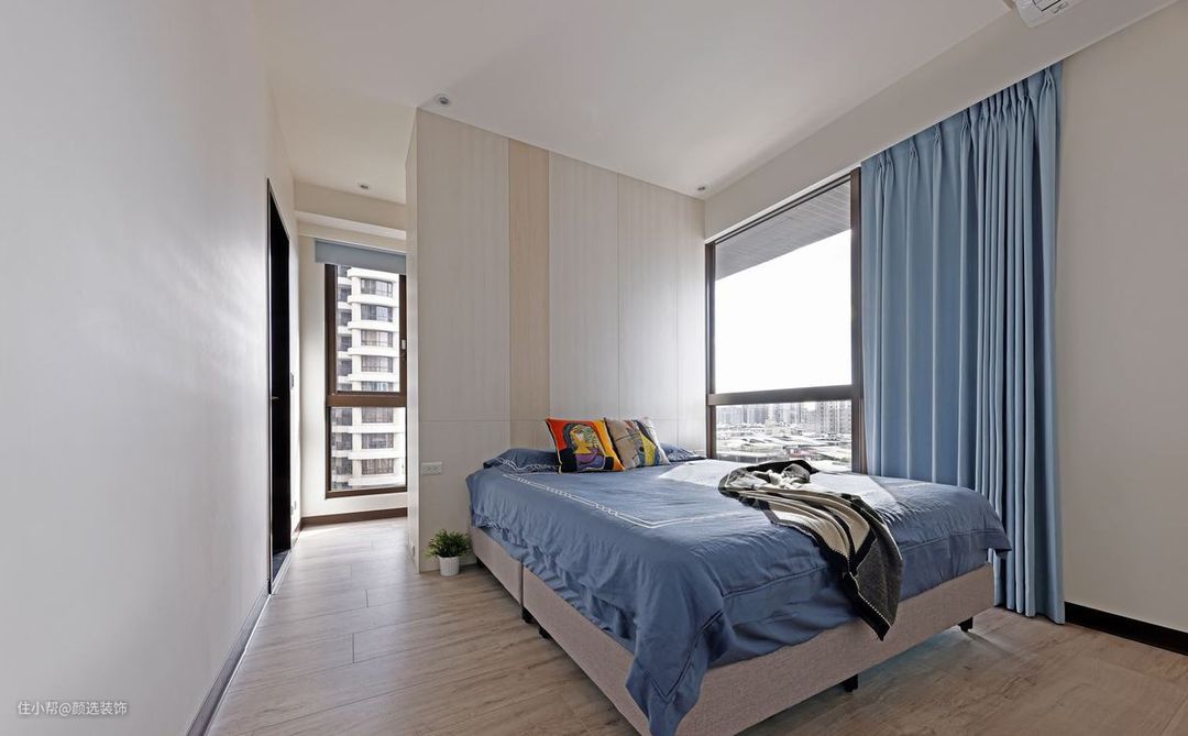 主卧空间为L型两面采光,在保留明亮光源的同时,亦围塑舒眠的场域,设计师规划了一面顶天高柜,既可当床头隔墙,也能兼具收纳机能,后侧空间则变身化妆更衣区,不仅做为场域区隔,也能具备实用功能。