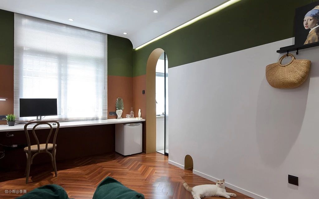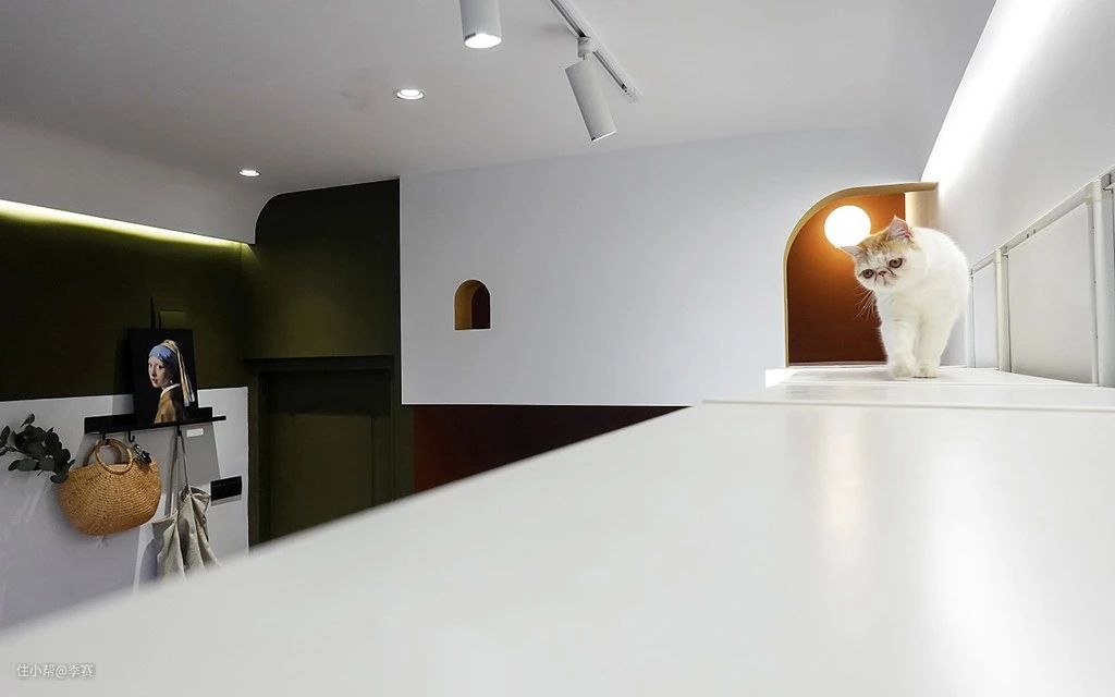 在厨房门洞边上设计了猫洞,设定kimo的如厕路径,将有可能散发的气味与起居室隔绝,又方便铲屎官铲屎