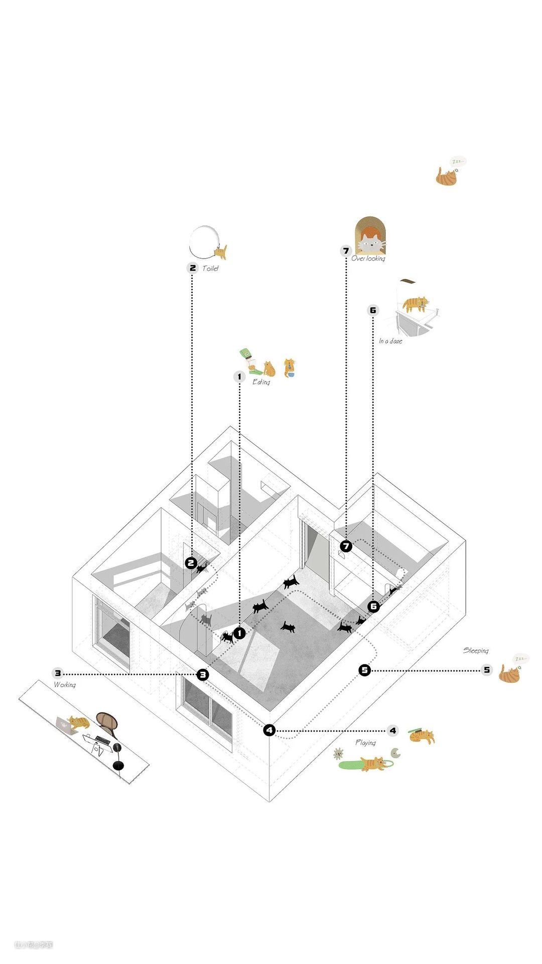 在屋内利用层架引导kimo进入它的小猫屋,方便窥探窗外的世界,满足其喜登高的特性,俯视人类 丢弃大件家具,释放空间,解放各功能,围绕墙壁做固定储藏收纳