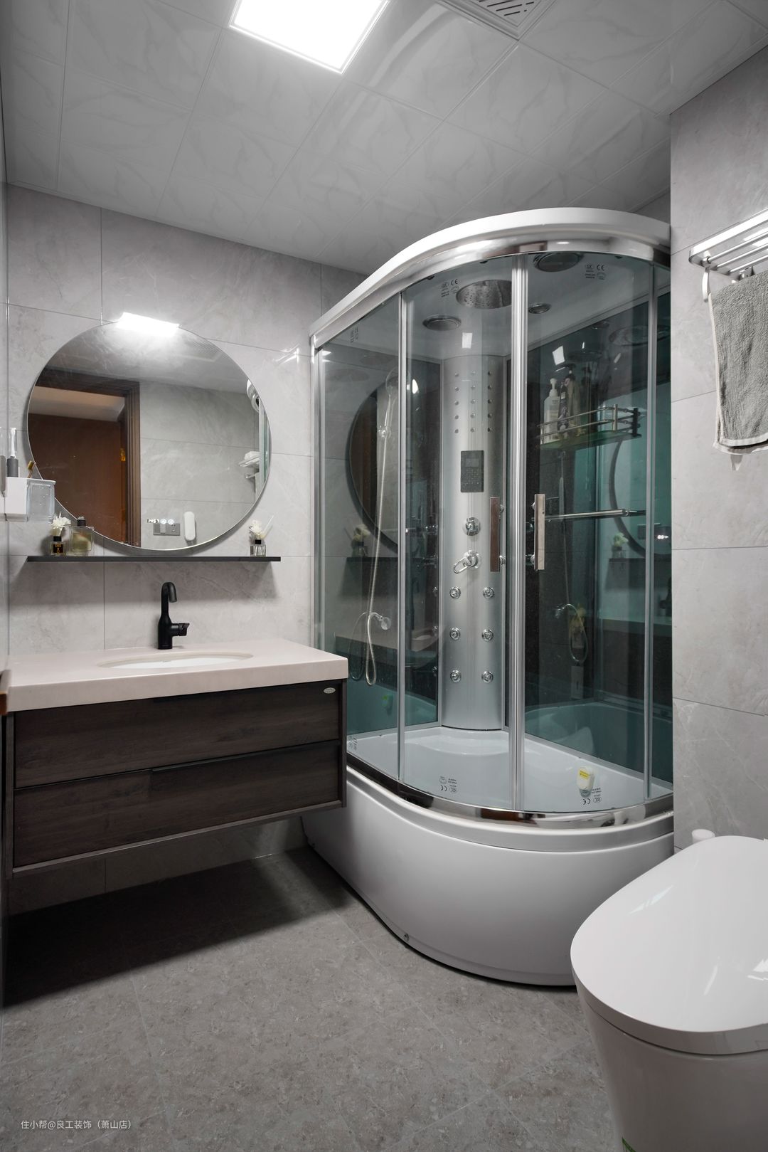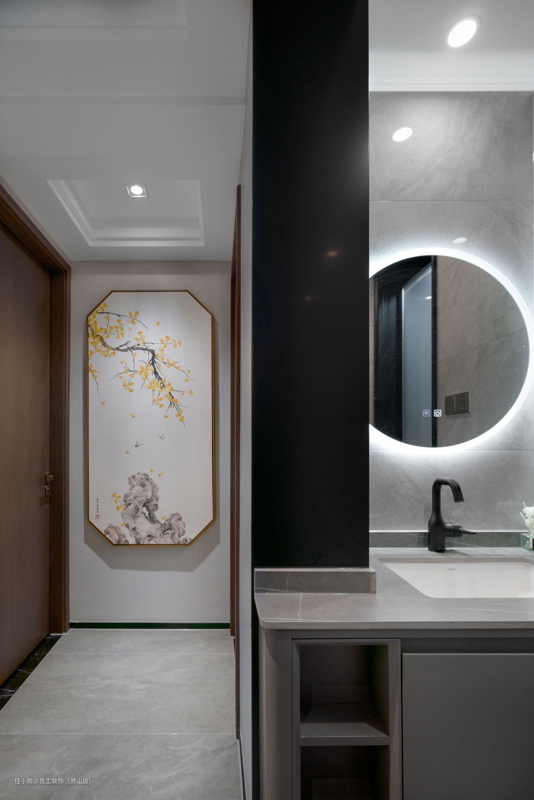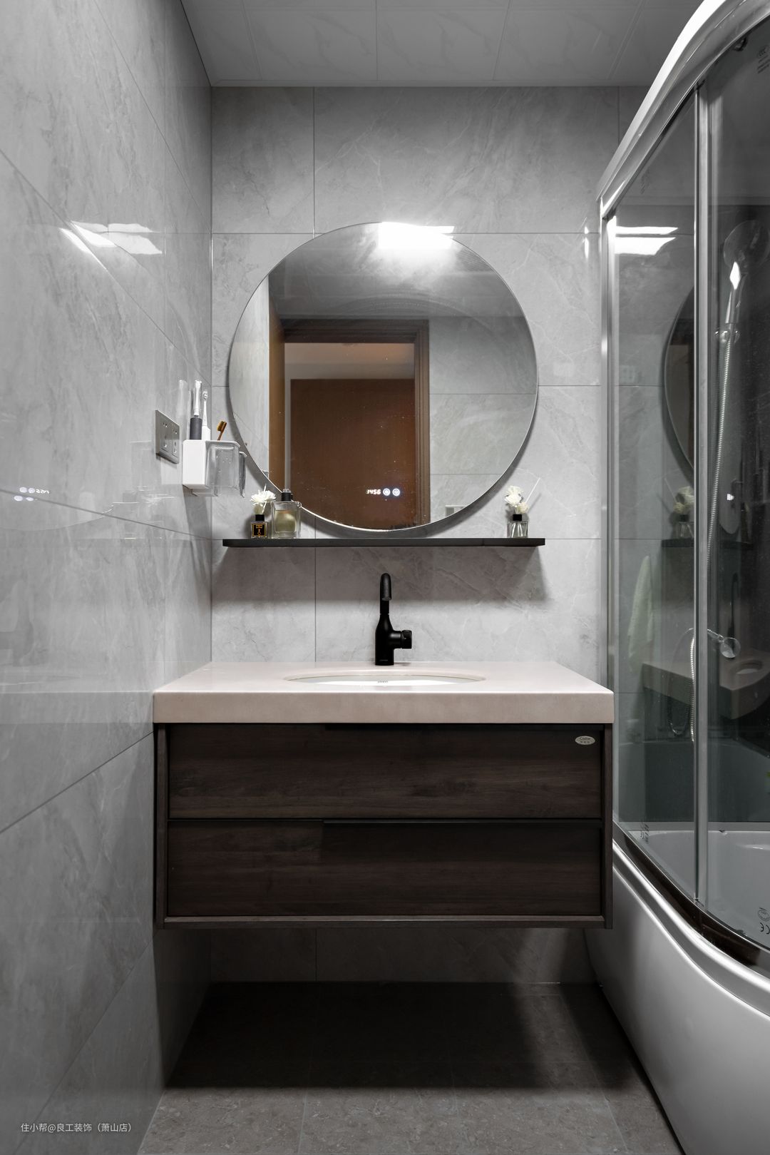 卫生间选用了雅致的浅灰色调,经久耐看不易过时。特意搭配圆镜,柔化空间里大理石的冰冷感,同时也形成“刚柔相济、方圆兼备”的空间美学。