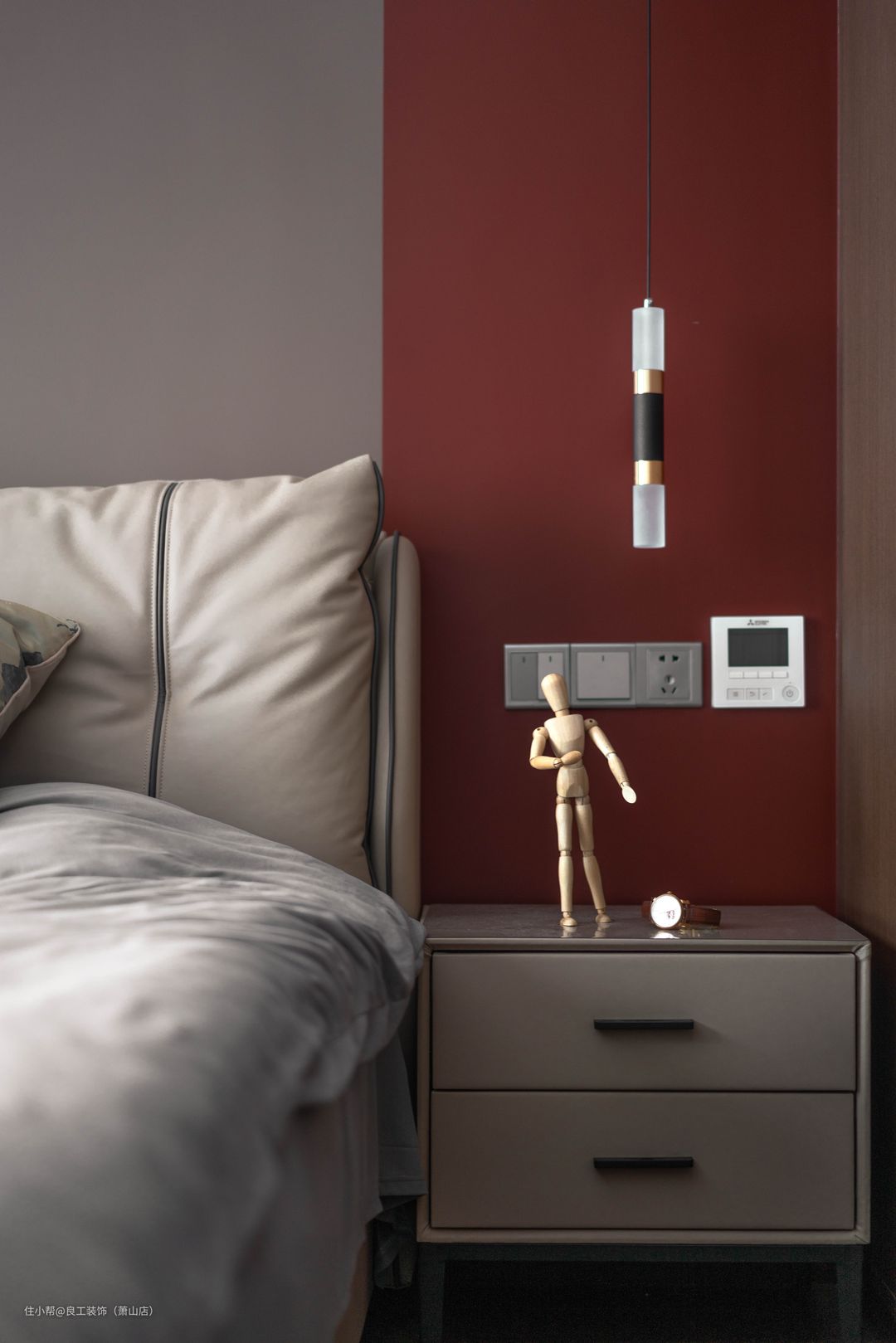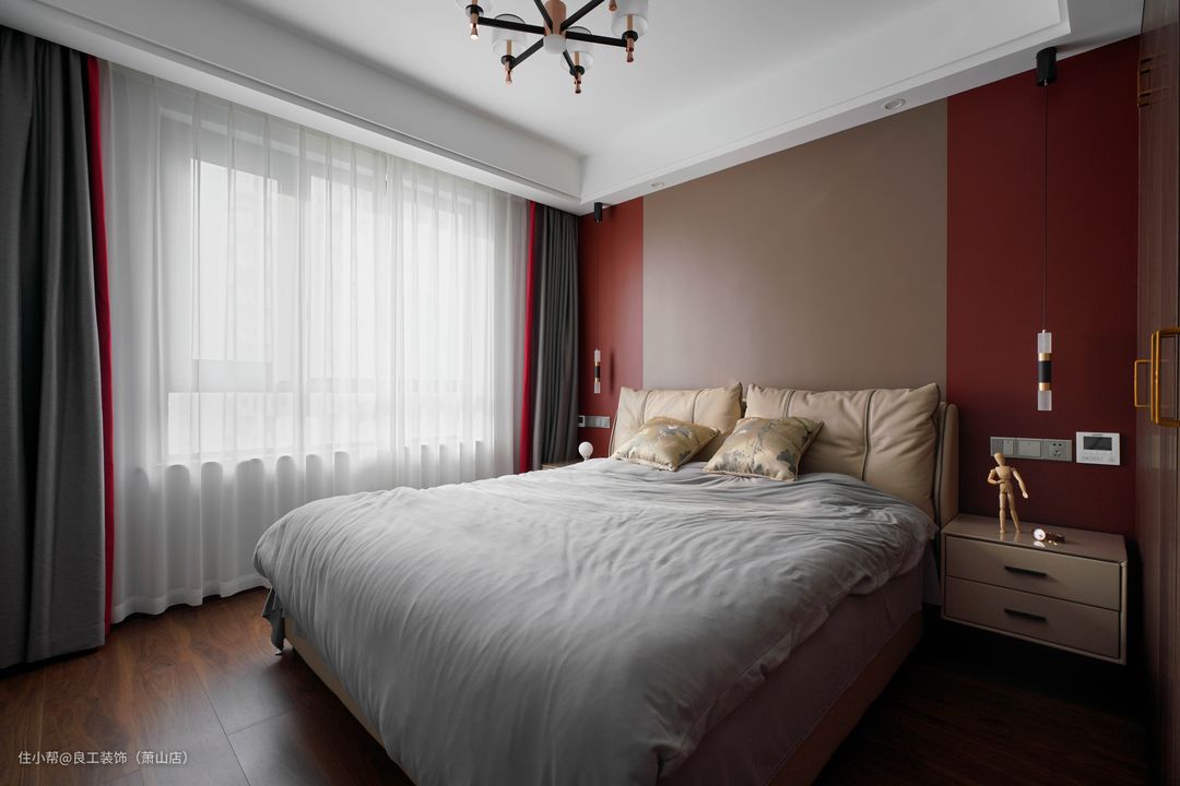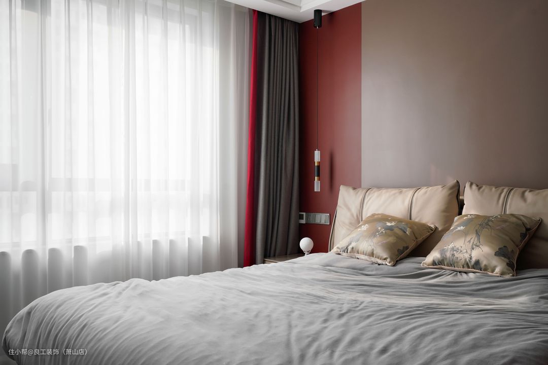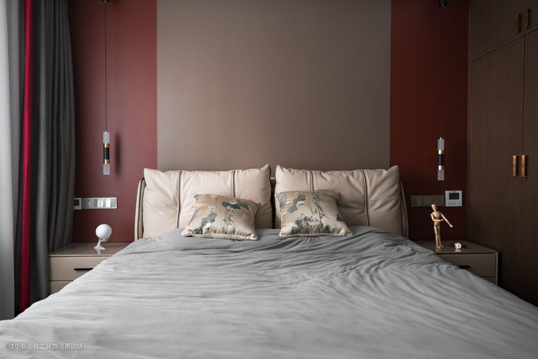 主卧设计融合了现代主义的简约与传统东方的形韵,奶咖色与胭脂红呈对称式布局,令空间沾染着端庄古雅的气韵,也氤氲出静谧的休憩氛围。