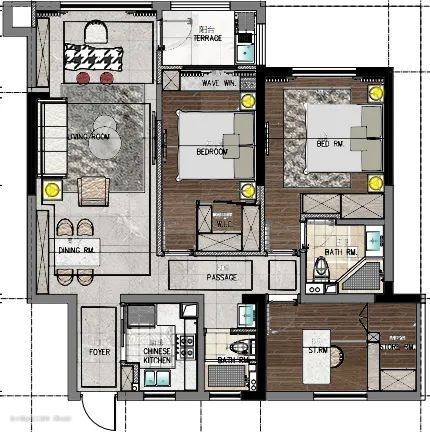 巧妙借鉴中式园林的透景,利用局部的格栅打破室内空间格局,丰富层次,以“虚”对比“实”的 存在,形而悦影,以影传神。