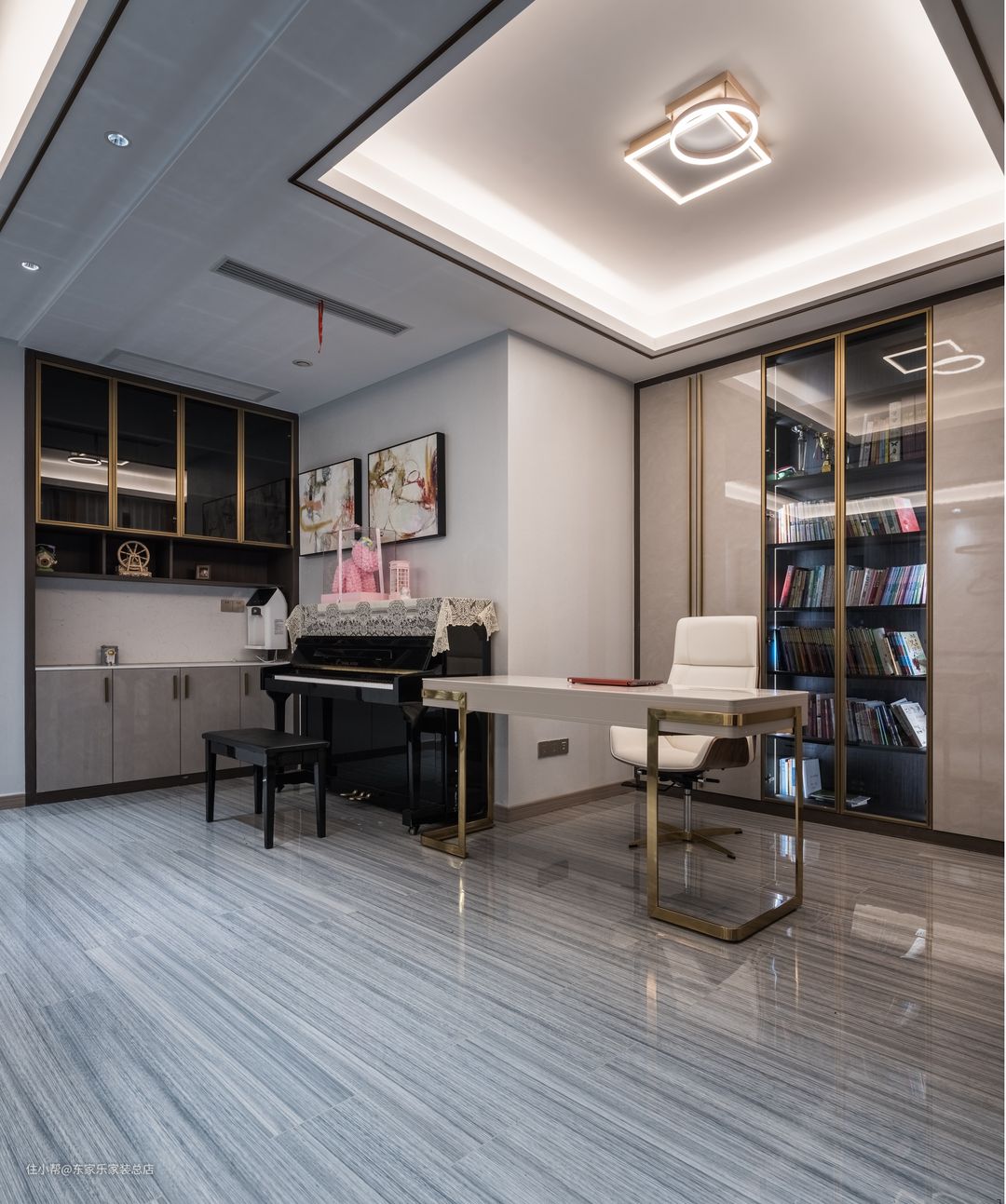 书房是将练琴区与阅读区放在了一起,整体来说利用了空间,地面选择了大面积横状条纹的瓷砖,使得室内的线条感更为丰富。