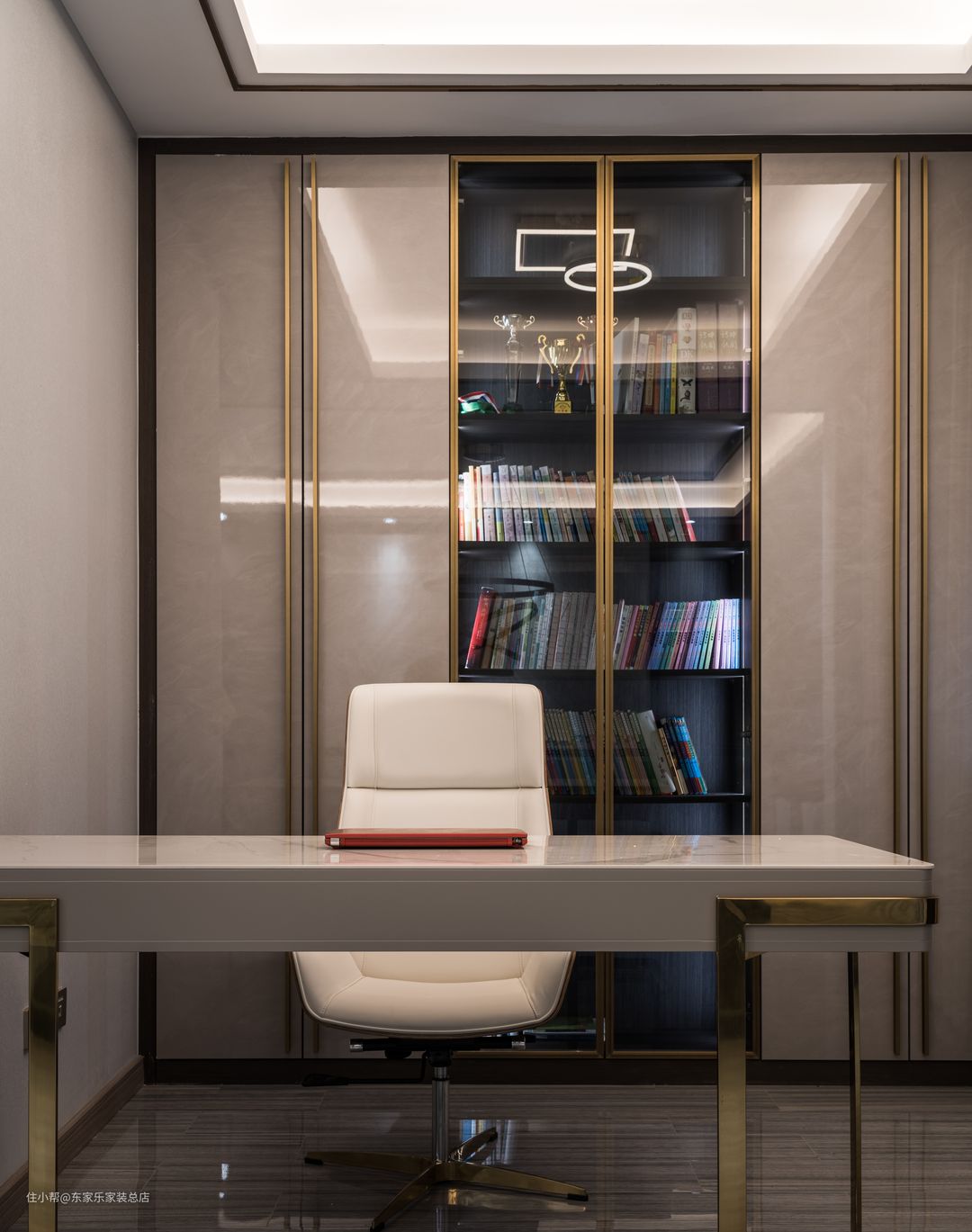 书桌就是简简单单的,背后的墙面做了收纳柜,让书本收纳的更加井然有序。整个的颜值也比较高。