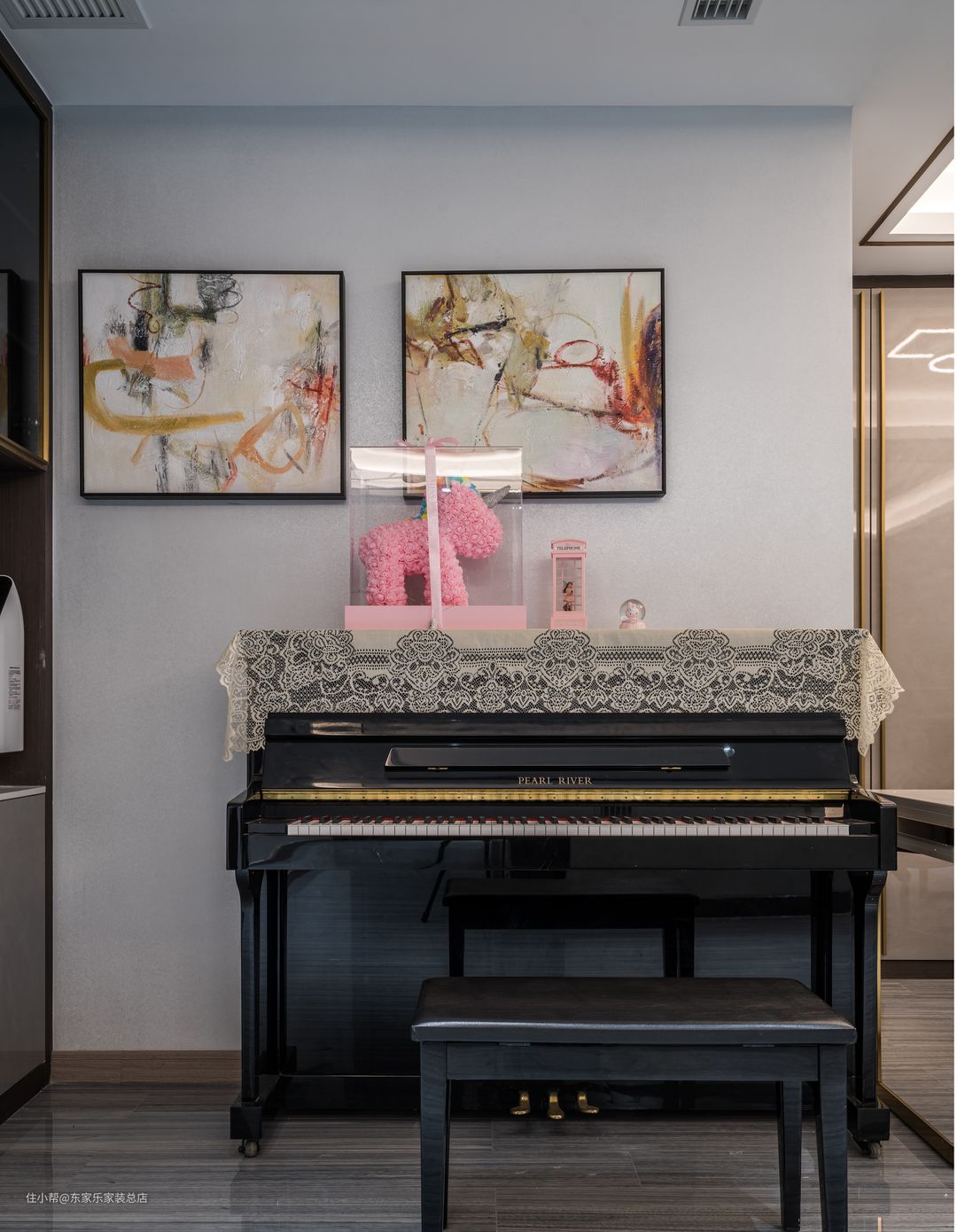 钢琴上方也有装饰画的设计,在单一的色调上有一些凸出,不会给人疲劳感,更加的有灵动性。