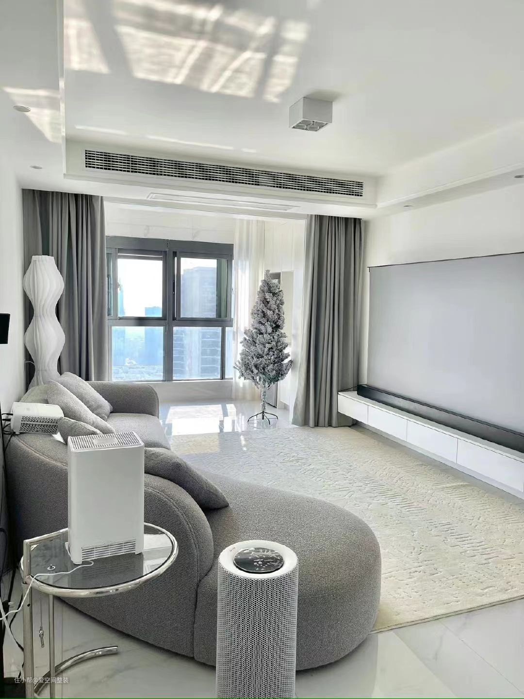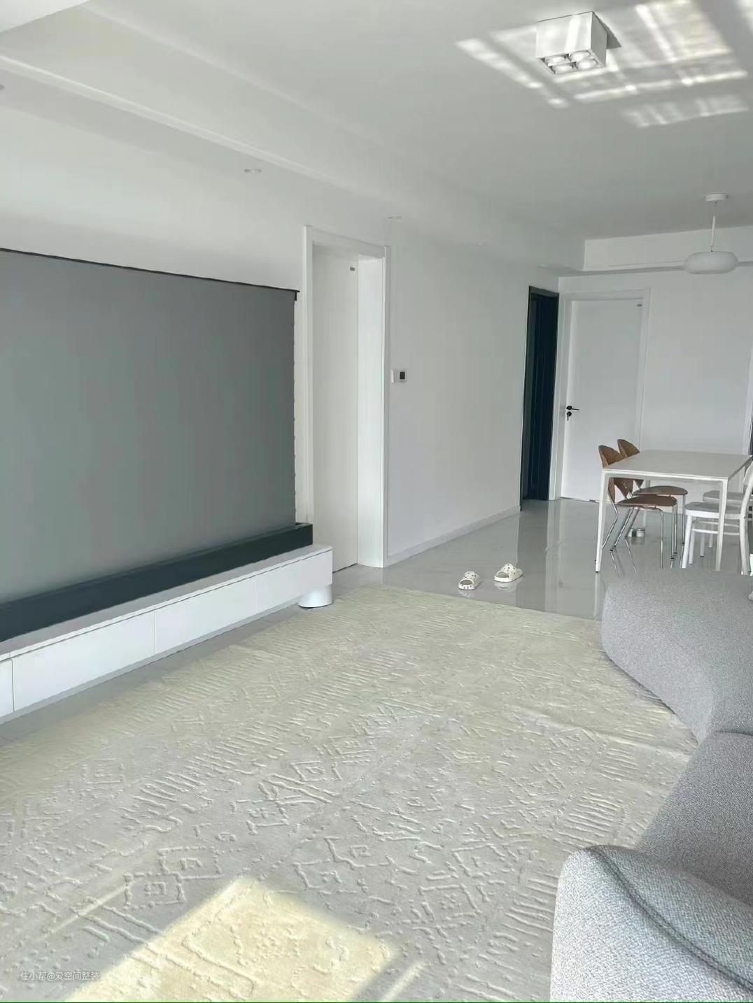 客厅主区域通铺一张厚实柔软的奶白色地毯,纯天然羊毛材质不掉毛不扎脚,波西米亚风格压纹细节满满,白色电视柜放置地拉式便携激光投影幕布,不会破坏墙体,高度任意调节,轻便铝合金外壳更是随时都能更换观影区域,堪称移动式家庭影院!