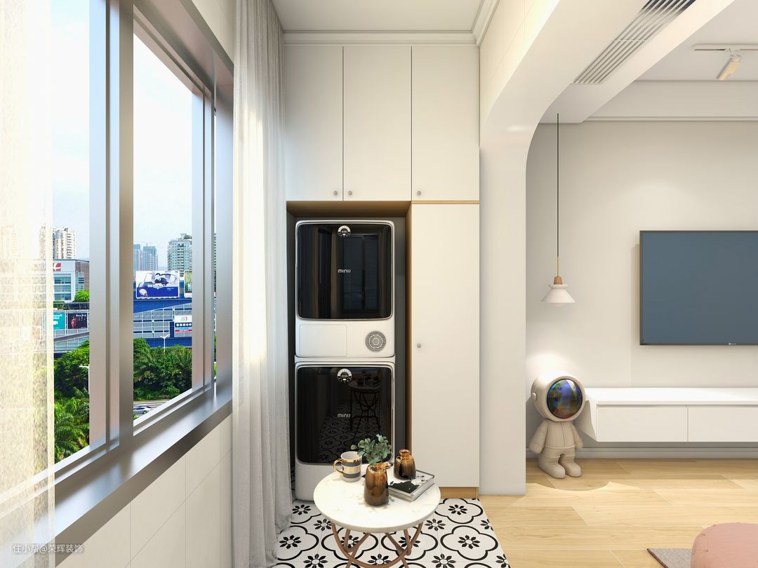 实用型的阳台,把洗衣机内嵌储物柜中,合理的利用了空间,也可以摆上小巧的桌椅,放上一小盆绿植,一束插花或一本书,轻松又惬意。