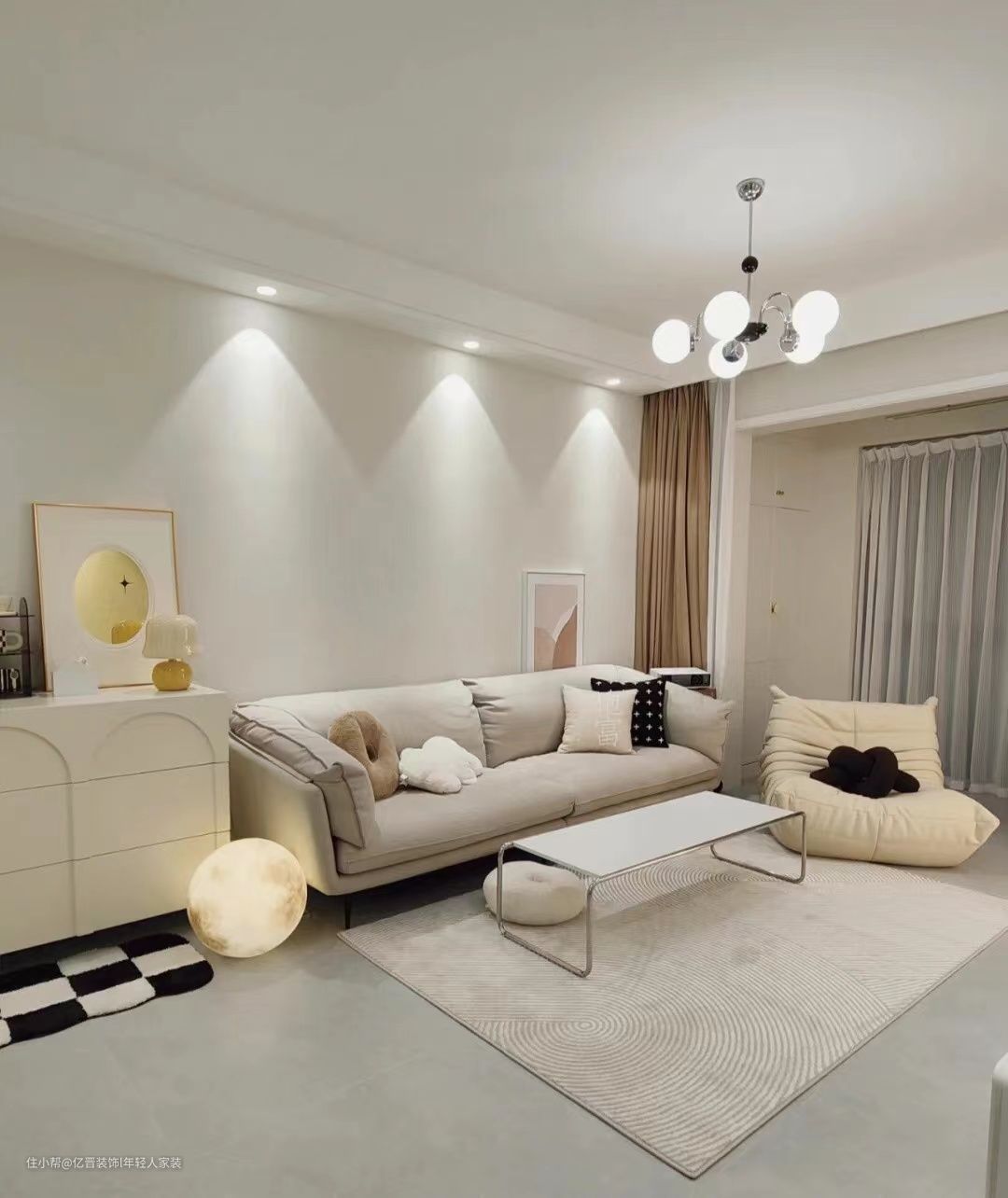 沙发背景留有大白墙,放置设计感装饰画并搭配射灯,让空间整体更有层次感