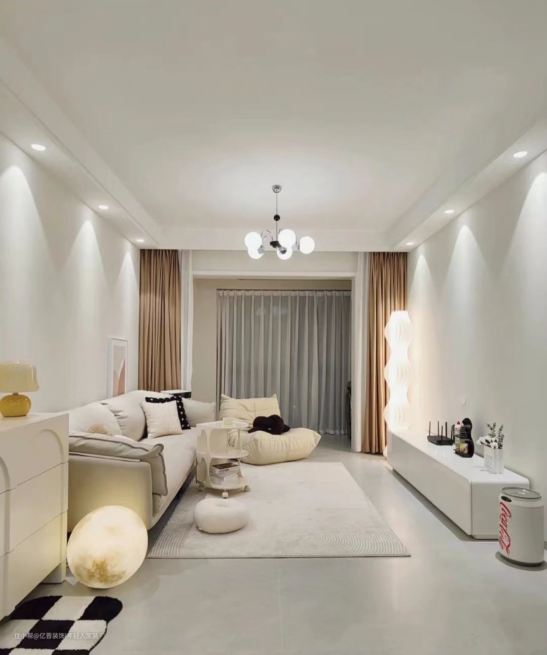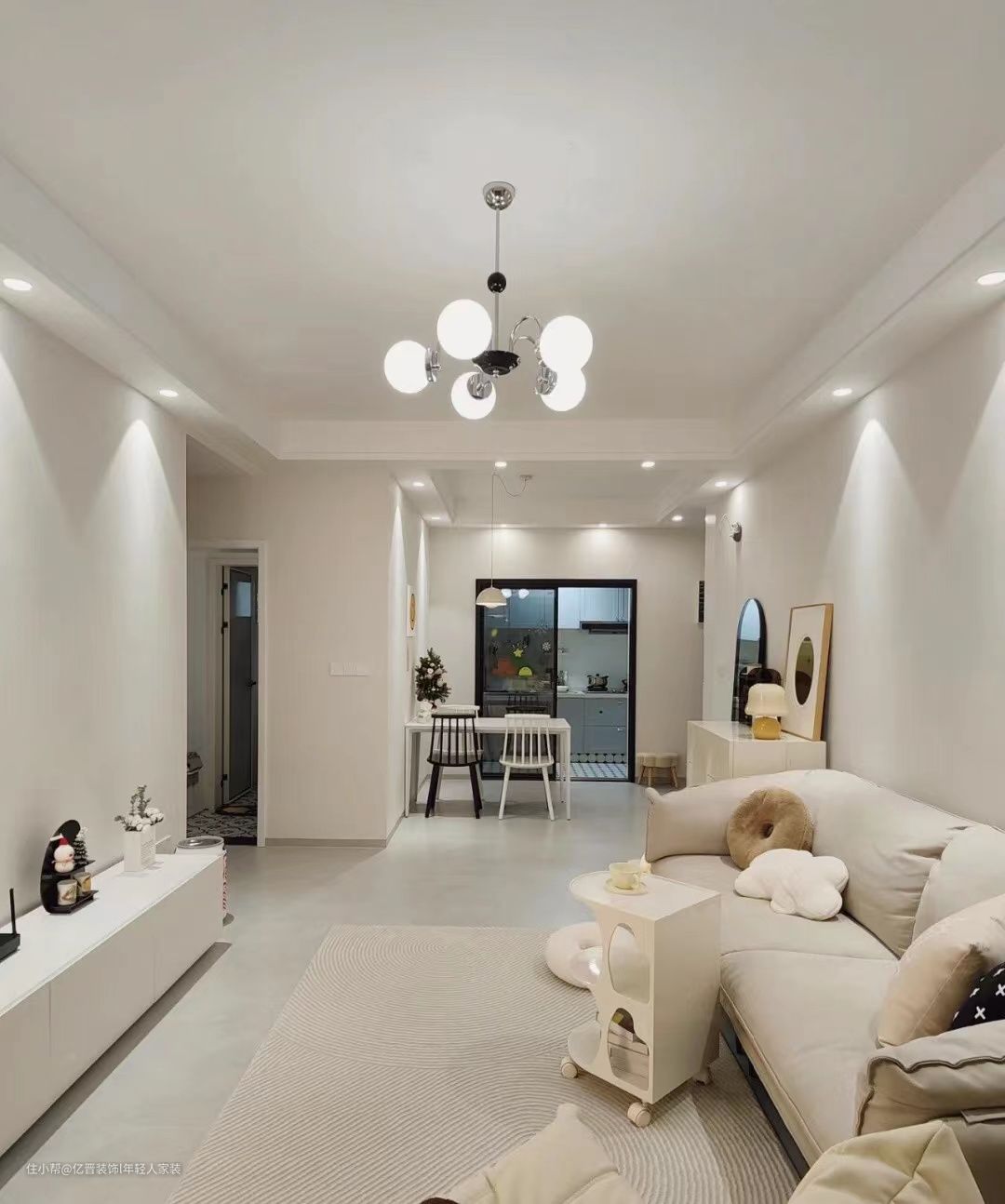 客厅,整体以白色为主,通铺浅灰色地砖,墙面是杏子灰,软装以白色、米白为主,搭配起来色彩和谐统一