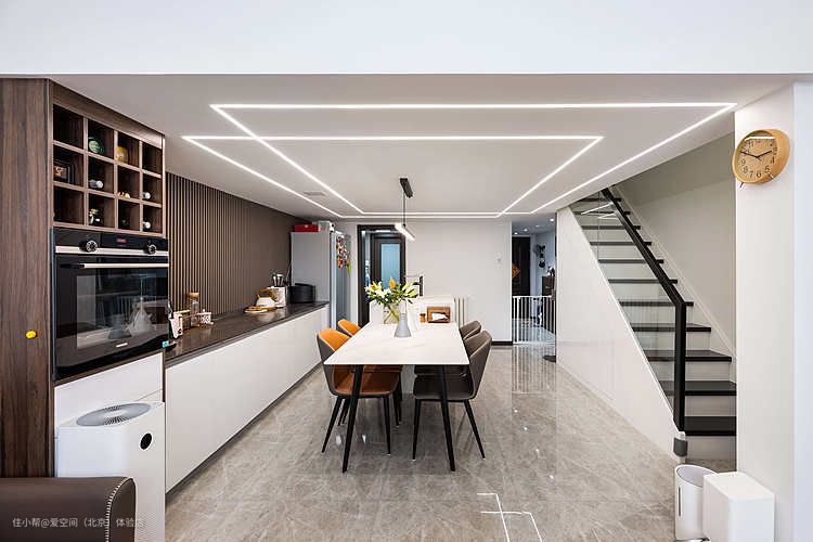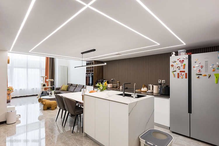 餐厅层高较低,不适用于复杂的吊顶。于是和客厅一样采取了简约线条的灯带装饰,搭配金属质感简约的餐厅吊灯,即可充分满足照明需求,也能让人将视觉重点放在主体的餐桌岛台以及餐边柜上。#灯带 #采光 #岛台