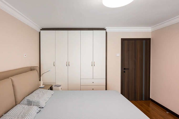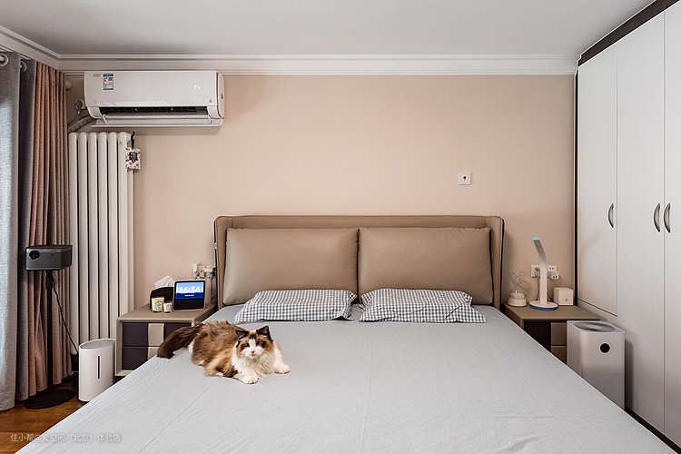主卧在布局、空间和灯光等方面都有轻奢元素的衔接,使得整个设计没有脱轨而息息相关,高级又不失品味。奶咖色乳胶漆,跟窗帘是同色系,优雅又浪漫。圆润的软包床头,将舒适的居住体验进行到底!#卧室