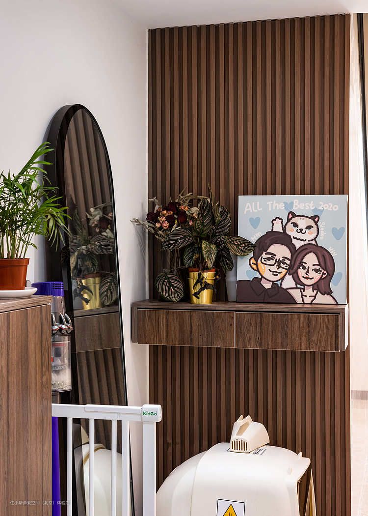 一进门的玄关装饰画就能告诉我们主要的家庭成员:即将新婚的年轻夫妻、以及一只可爱的小布偶。宠物的栅栏、猫砂盆、还有满是猫毛的吸尘器,处处细节都体现着夫妻二人对宠物的喜爱和用心。#装饰画