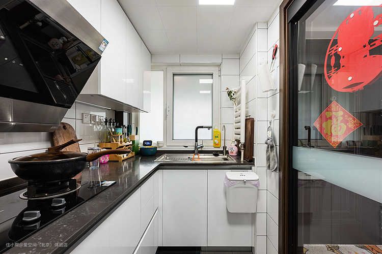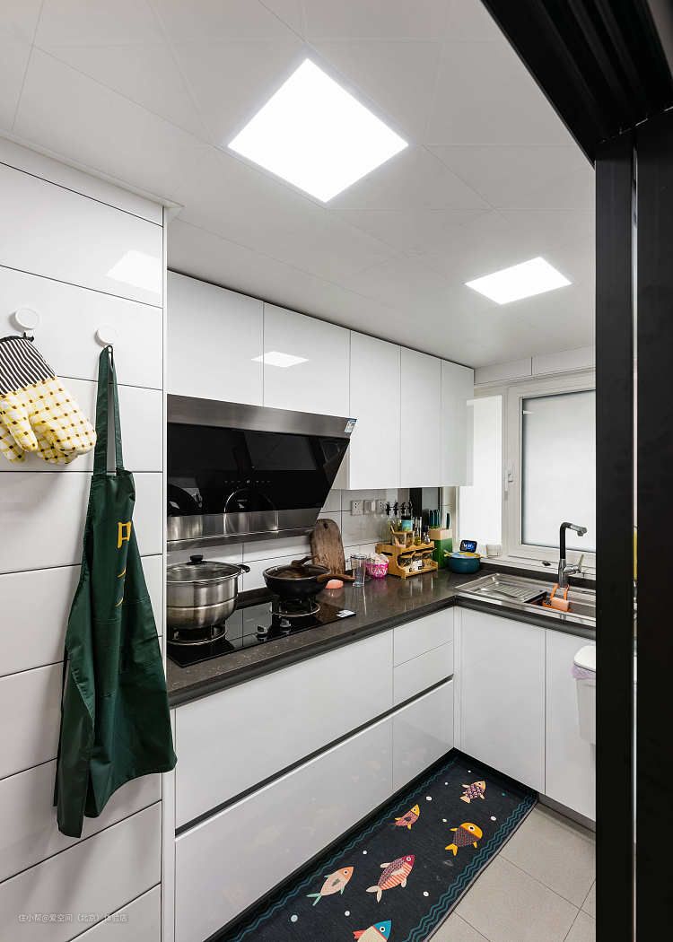 虽是复式户型,但厨房空间较小,于是橱柜采用了L型布局。以墙角为原点,两侧展开成L型,是厨房布局中最节省空间的设计。储物柜、水池、备菜区、加工台、调料区、灶台、装盘区各区域分工明确,动线合理。#L型厨房