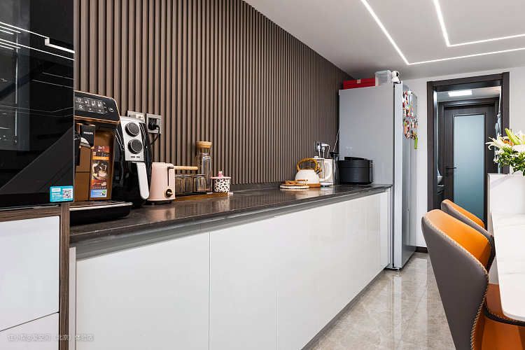 超长餐边柜台面,不仅可以作为咖啡机、面包机等小家电的收纳空间,也能作为西厨备菜区使用。四个插座充分满足多个小家电同时使用的需求,一旁放置冰箱,拿去食材清洗制作动线也合理顺畅。#餐边柜