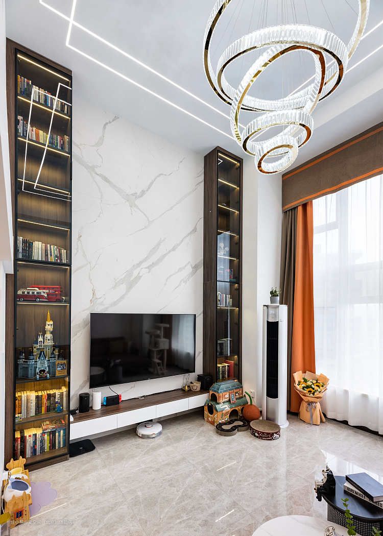 由于层高较高,于是仅仅采用大理石电视背景墙会略显单调,于是在两侧增加了两个通顶装饰柜。实现起来也并不困难,根据板材、饰面的不同,也会有不同的呈现效果,可塑性较强。书柜的明格可以满足各种需要,拼好的乐高、摆件都是不错的装饰物。#背景墙