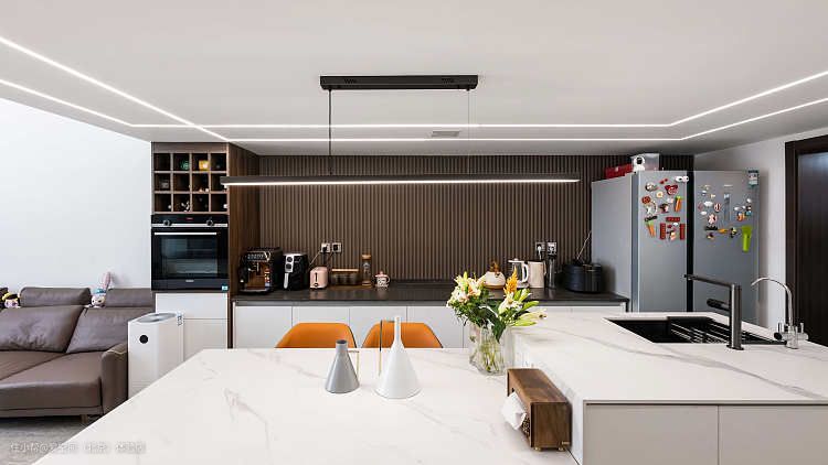 餐厅岛台一体化设计,对于空间的利用会更加细致,也能让餐桌与岛台的质感统一,让空间风格和谐大气。餐桌高度通常在72-75cm之间,为了备餐舒适,岛台的高度最低也要80cm,90-95cm更舒适。