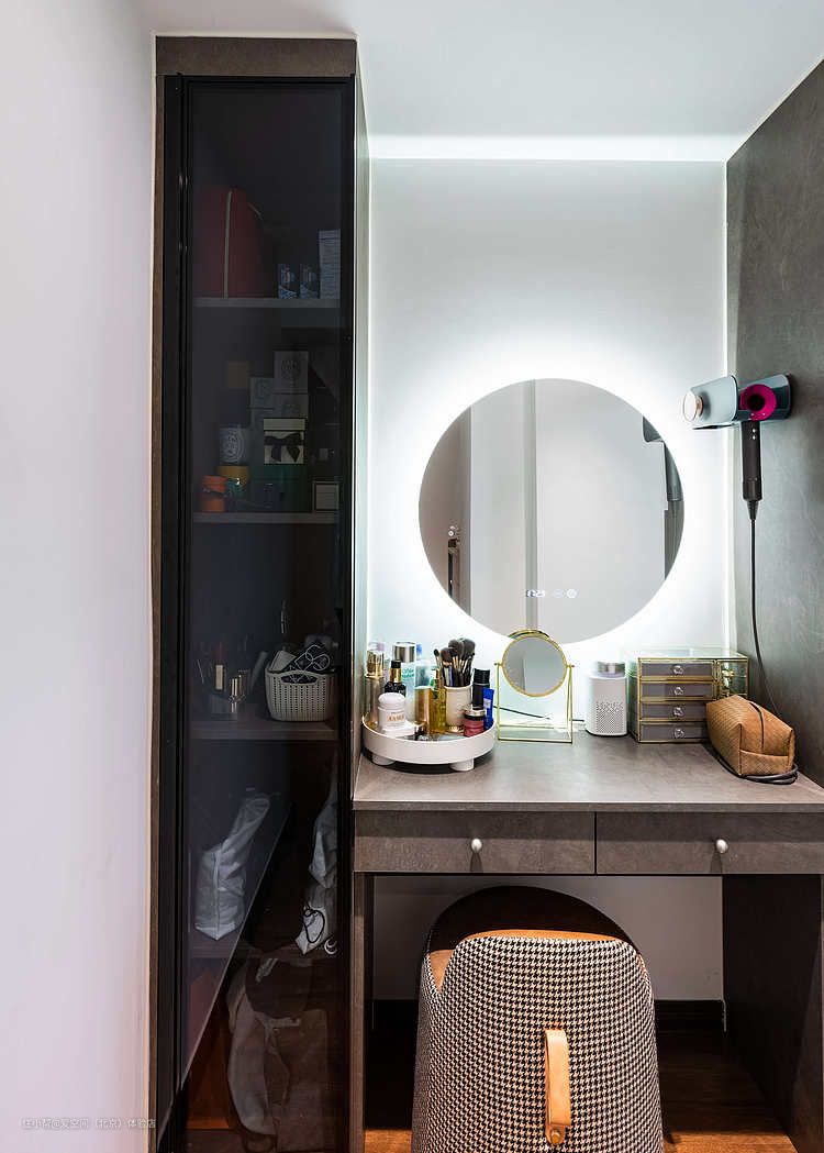 走廊的尽头充分利用空间打造梳妆台及收纳柜。热衷于收藏香薰的女主人的藏品们都有处可依,平时化妆造型时常用的物品也随手拿去,十分便捷。生活的幸福感,全都储存在点点滴滴的细节中。#梳妆台