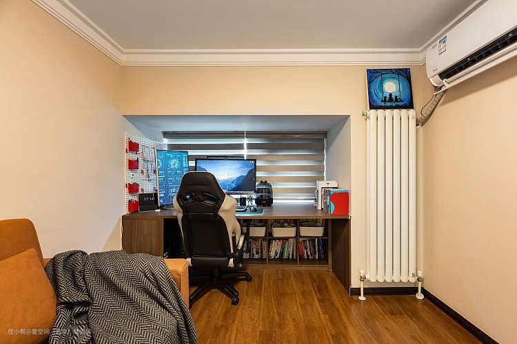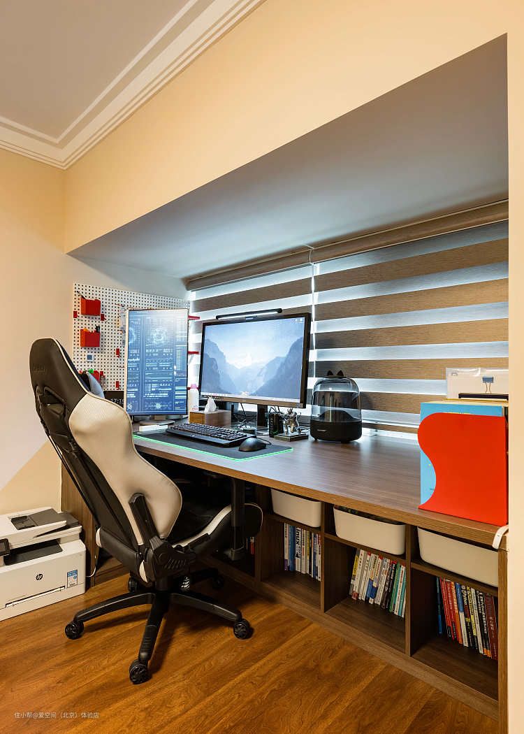 男主人和女主人平时工作都很忙,回到家有时也需要加班,所以需要有工作空间,将其中的一间卧室设计成书房,便于业主平时工作。#书房