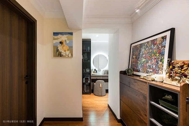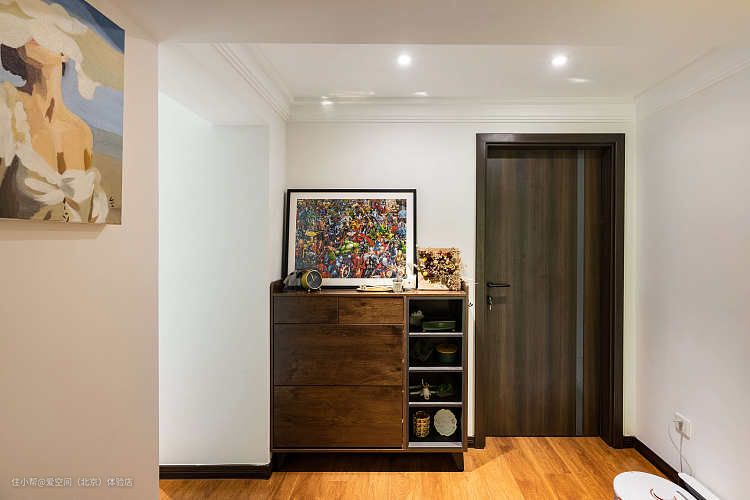 深色地板与胡桃木色收纳柜、卧室门使得整个空间略显暗淡,于是在装饰画的选择上采用了色彩丰富的拼图以及浅色系的静态人物画,让整个空间的层次感一下提升。#收纳柜