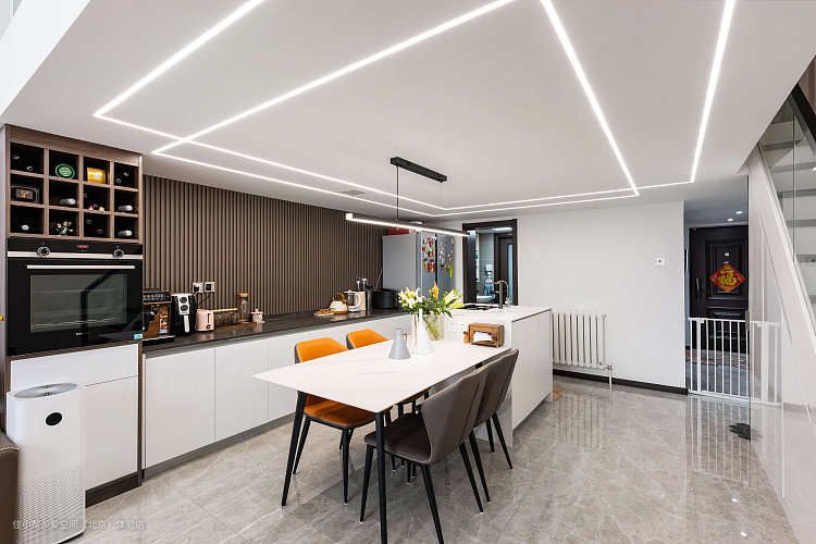 餐厅层高较低,不适用于复杂的吊顶。于是和客厅一样采取了简约线条的灯带装饰,搭配金属质感简约的餐厅吊灯,即可充分满足照明需求,也能让人将视觉重点放在主体的餐桌岛台以及餐边柜上。#灯带 #采光 #岛台