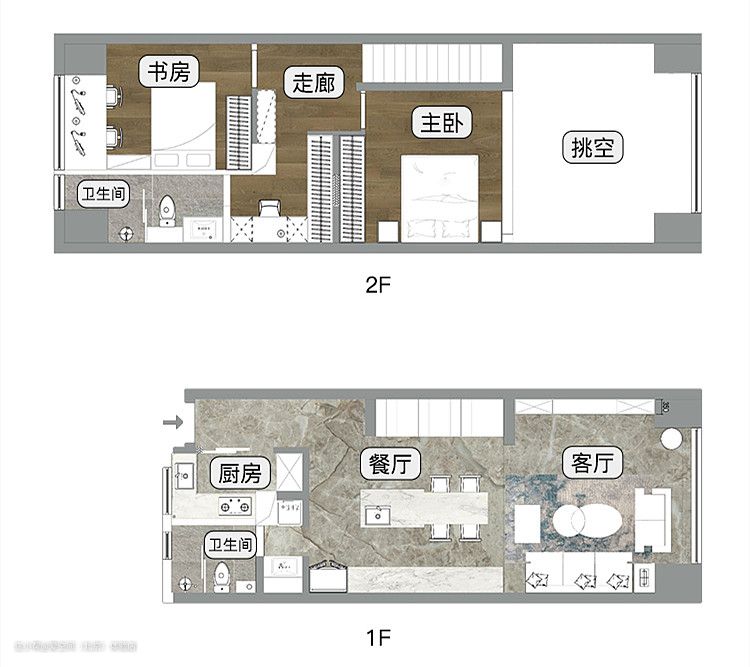 1、一楼层高2.15m,二楼层高2.35m,再加上各个功能空间面积有限,导致空间容易让人感觉昏暗压抑; 2、本房屋作为婚房使用,年轻的90后夫妻二人,希望空间能有更多的交互性,即使身处不同功能空间,家人之间也可以更好地进行交流; 3、希望设计师能够注重空间的实用性,也能通过对意式轻奢元素的应用,体现出家居空间的时尚感和生活的品质感。