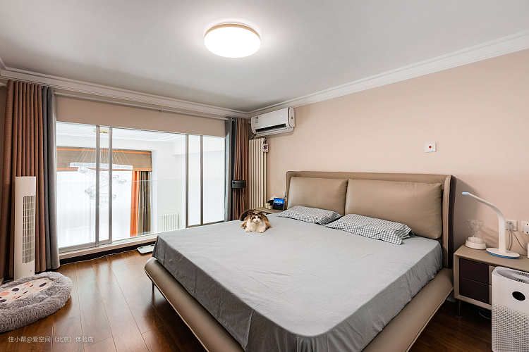 主卧在布局、空间和灯光等方面都有轻奢元素的衔接,使得整个设计没有脱轨而息息相关,高级又不失品味。奶咖色乳胶漆,跟窗帘是同色系,优雅又浪漫。圆润的软包床头,将舒适的居住体验进行到底!#卧室
