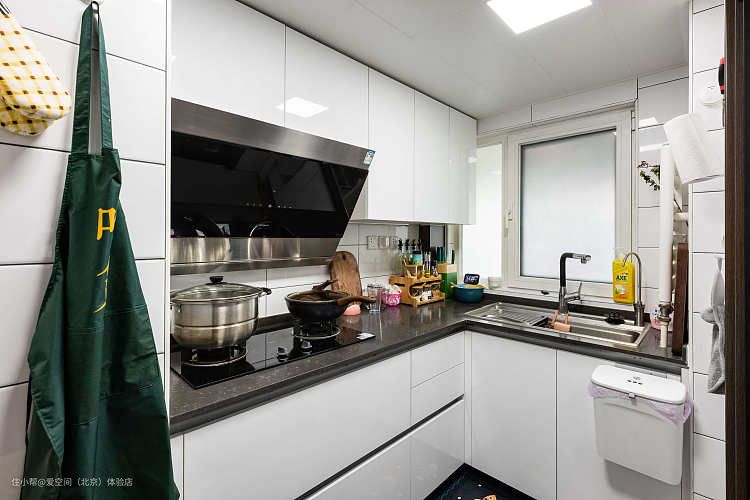 虽是复式户型,但厨房空间较小,于是橱柜采用了L型布局。以墙角为原点,两侧展开成L型,是厨房布局中最节省空间的设计。储物柜、水池、备菜区、加工台、调料区、灶台、装盘区各区域分工明确,动线合理。#L型厨房