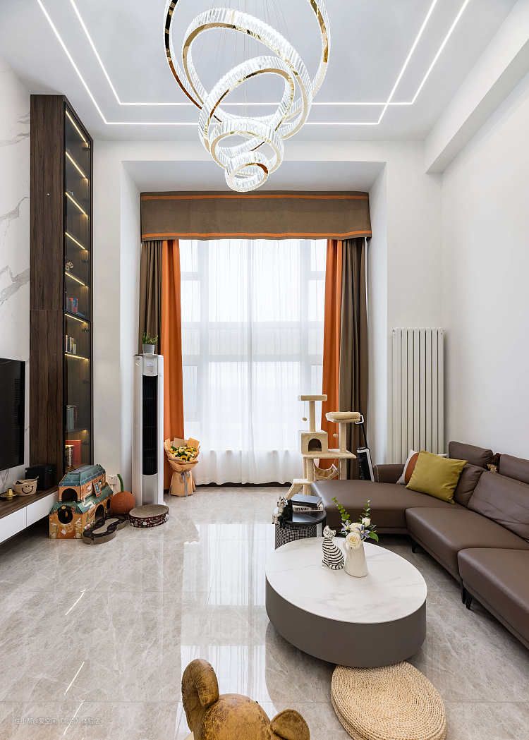 沙发采用L型布局,坐落有主次感,具有较好的灵活性和可动性。棕色皮质沙发与整体的轻奢风格也很搭。落座的舒适感让人不想起身,可惜购买不到同款,因为是屋主小姐姐从佛山厂家直接定制的,软硬始终,下陷也不大,心动ing~#客厅