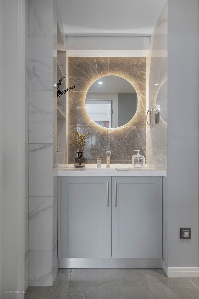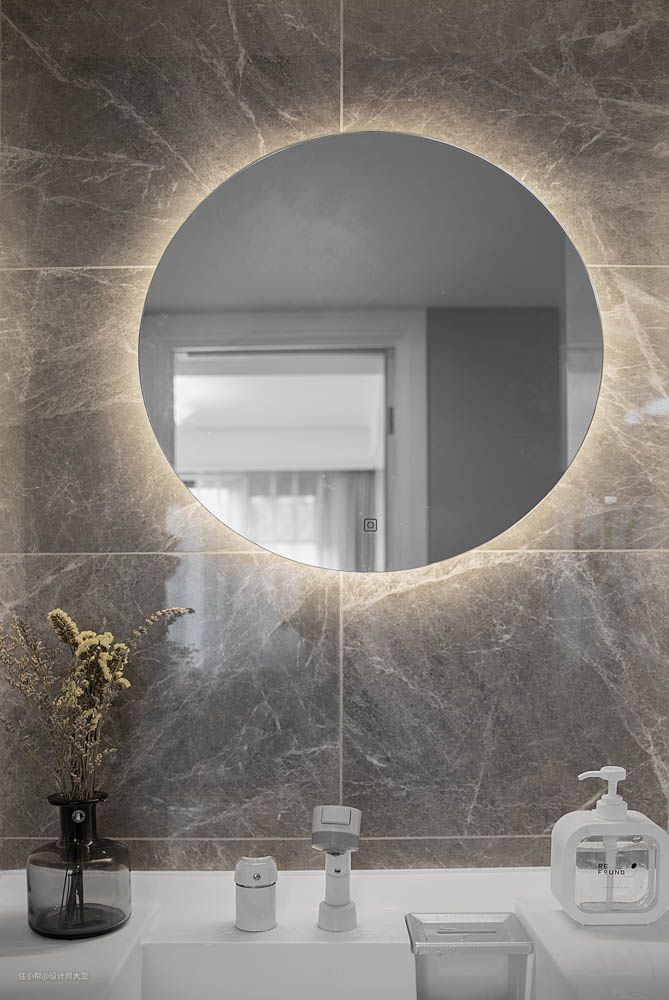 洗手台以白色大理石为主要材质,清爽,且带些高贵的冰冷质感。 洗手台的圆形镜面背后装设LED灯,既可以作为照明,也可以作为环绕式“小太阳”装饰,小心机别具心裁。