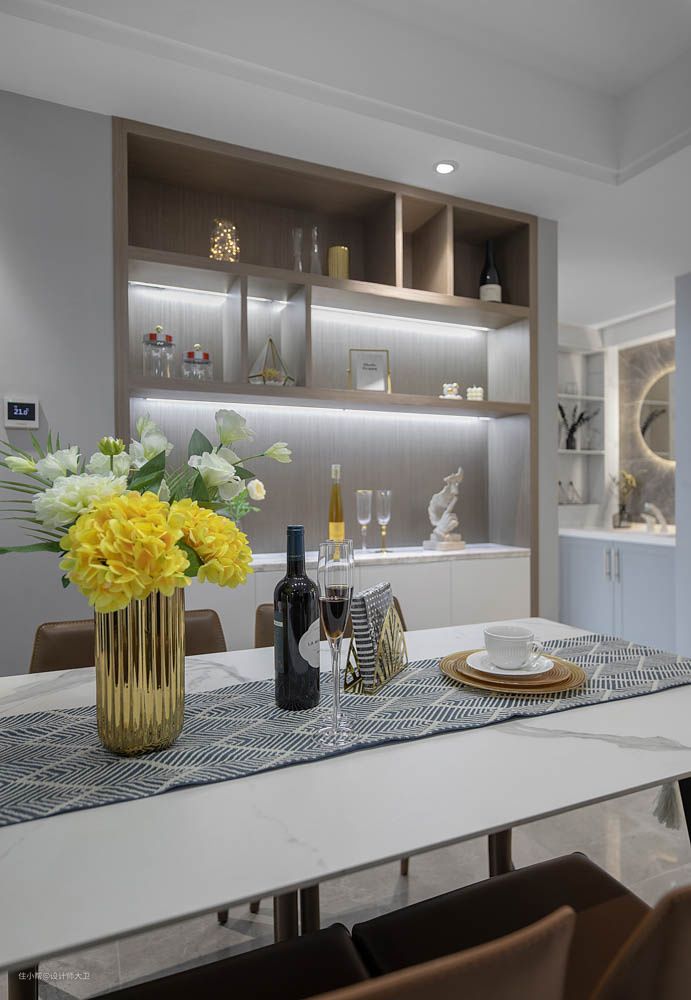 厨房和餐厅用深色玻璃移门分隔。玻璃制品的使用,也是轻奢风格常用的设计技巧。 玻璃移门的设计可以阻断厨房油烟四散的问题。