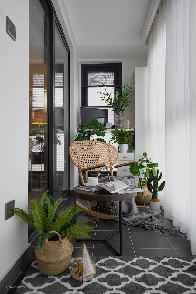 阳台设计成两半,一半就是常用的洗衣阳台,另一半以原木假墙体分隔,作为一个休闲阳台。 休闲阳台摆放绿植、盆栽,放置有藤条桌椅,轻松慵懒却不失时尚感。 这才是享受的生活。