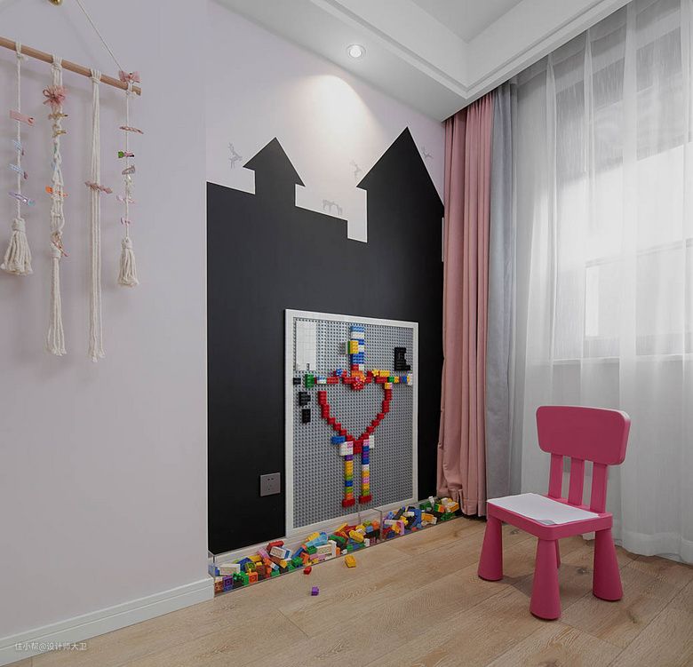 小女儿房间以可爱粉色系为主,墙面的乐高黑板墙都是后期设计师手绘上去,配合星星灯,云朵壁灯,显得比较活泼可爱,给小女儿营造一个梦幻般的生活乐园。