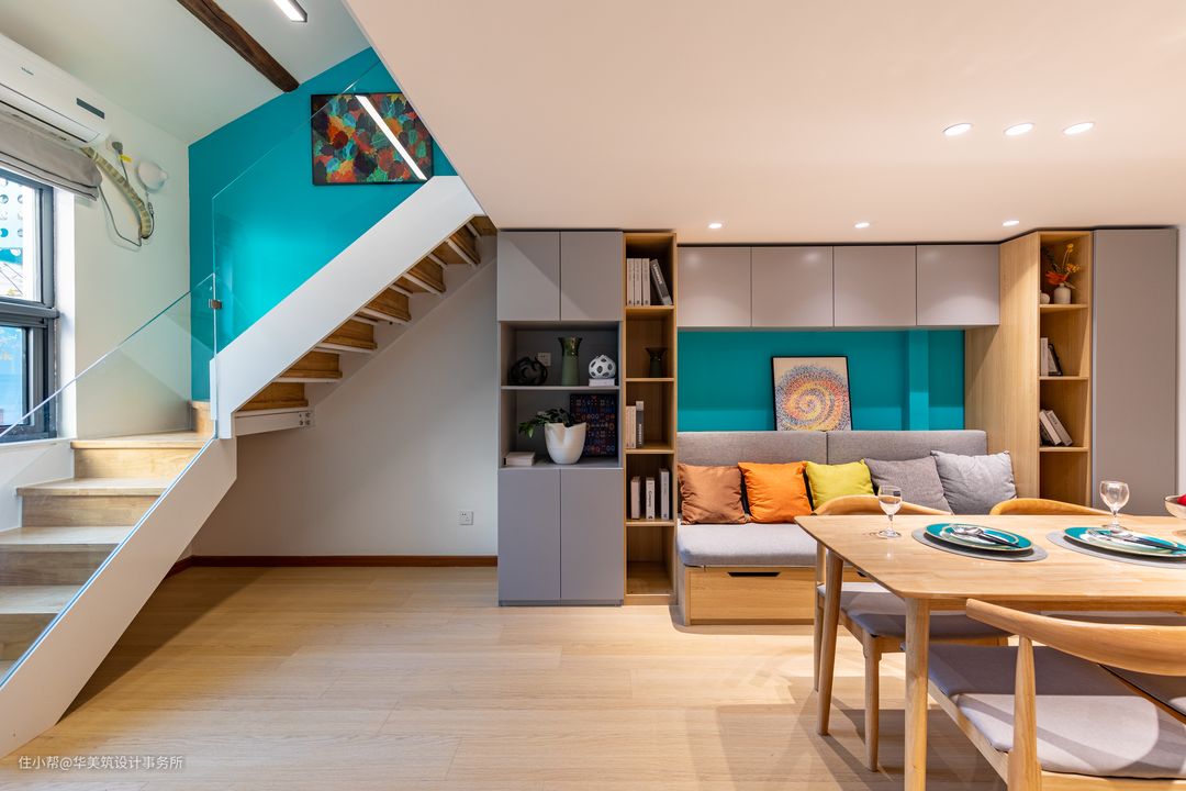 改造前后对比:简洁的现代家具设计塑造了客厅乃至这个LOFT整体的精致布局。 钢化玻璃,大面积的定制层板柜体营造令人羡慕的储物收纳解决方案,优雅地展现主人对年轻时尚的挑剔热爱。超喜欢这个阁楼空间,每一个角落和每一个墙面都在想更好如何利用它,温暖的聚光灯如何与蓝色的墙面 形成鲜明对比,这是一个金村里后,走进这个房间,就会让客人“哇”的空间。 仅天花板就可以让您叹为观止——我们把80年的原木可视化,仿佛就在旧世界的感觉,涂刷一层清漆,但又不是现代的气息,巧妙的立旧。定制沙发,且沙发下还可以储物、悬挂的吊柜,甚至后面的沙发靠背上方,都可以储物。#楼梯#LOFT#玻璃扶手#原顶#玄关