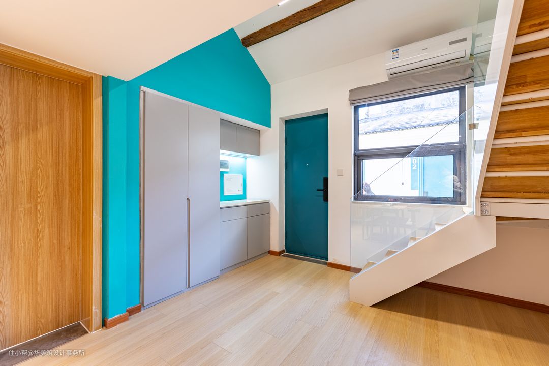 项目坐标地址:北京市大兴区 屋主年龄:27 设计时间:2021-5 竣工时间:2021-10 女主人回到家时,盼望透过承载暖度的现代家具,将那段温馨放在眼前,女主人说,很喜欢大自然和艺术,回到老宅子后,选定居住在这里、庭院里有小池流水,五环边是闹中取静的地段,延揽外部绿意,打造能沉淀心绪,又具有生命力的LOFT家,期望生活藏有撼动于心的微小感知,由木质调与深浅不一的蓝色系。 微风轻拂,以简约线条、活泼温暖的色系,使这套民宅于宁静间带有活跃,线条和色彩成为视觉的导引。 解决难题:储物空间过少,不能满足居住的储物收纳需要,原自建房缺乏系统性的统筹设计,居住氛围为0. 根据场地现状条件完善基础设施、配备生活所需的基本功能,提升居住条件 利用模块化的家具形成小组合模块,便于灵活组合、 利用层高,增加垂直空间利用率 利用抬高空间增设储物模块,增强空间可用性 打造层次感,创造功能区明确、指示清晰的空间视觉体系。