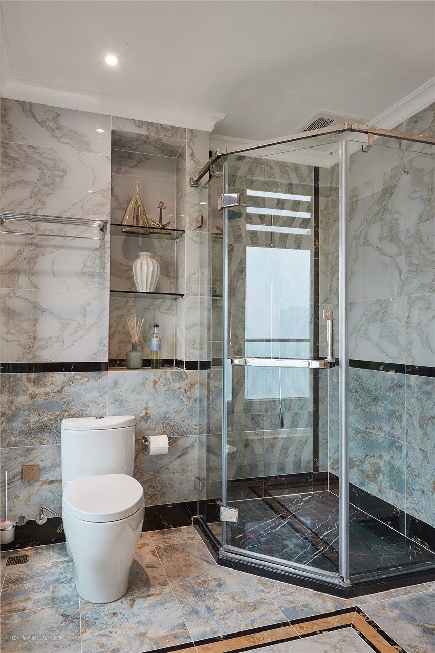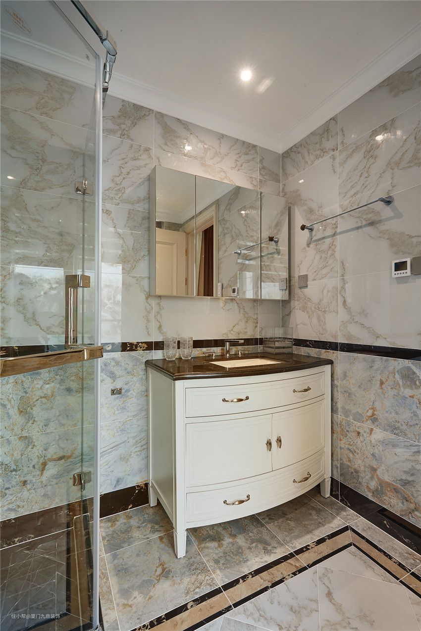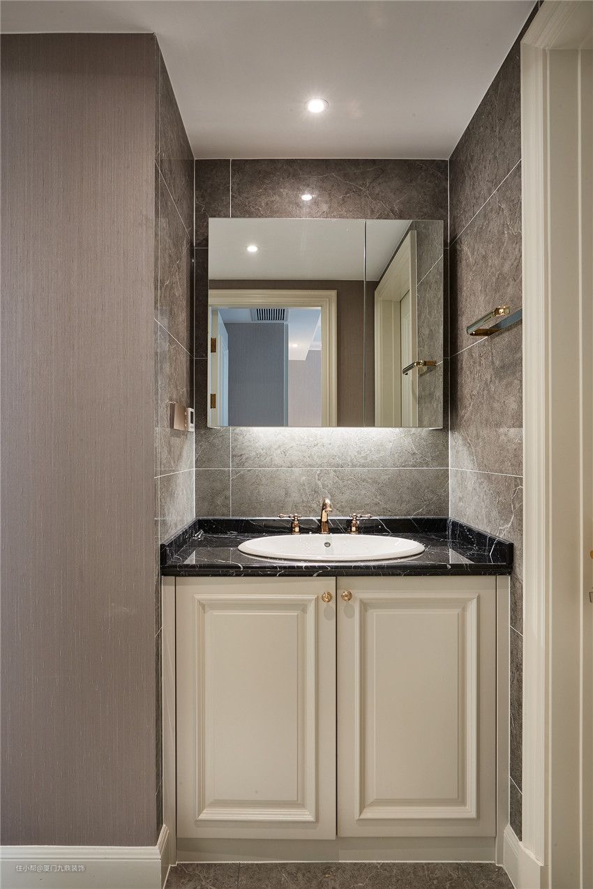 卫浴空间虽然不是生活的重心,却是一天繁琐工作后调剂的栖息所,设计师利用不同深浅纹路的仿岩磁砖拼贴出特色墙面,视觉能从地面延伸至墙面,给业主带来高品质的细节享受。