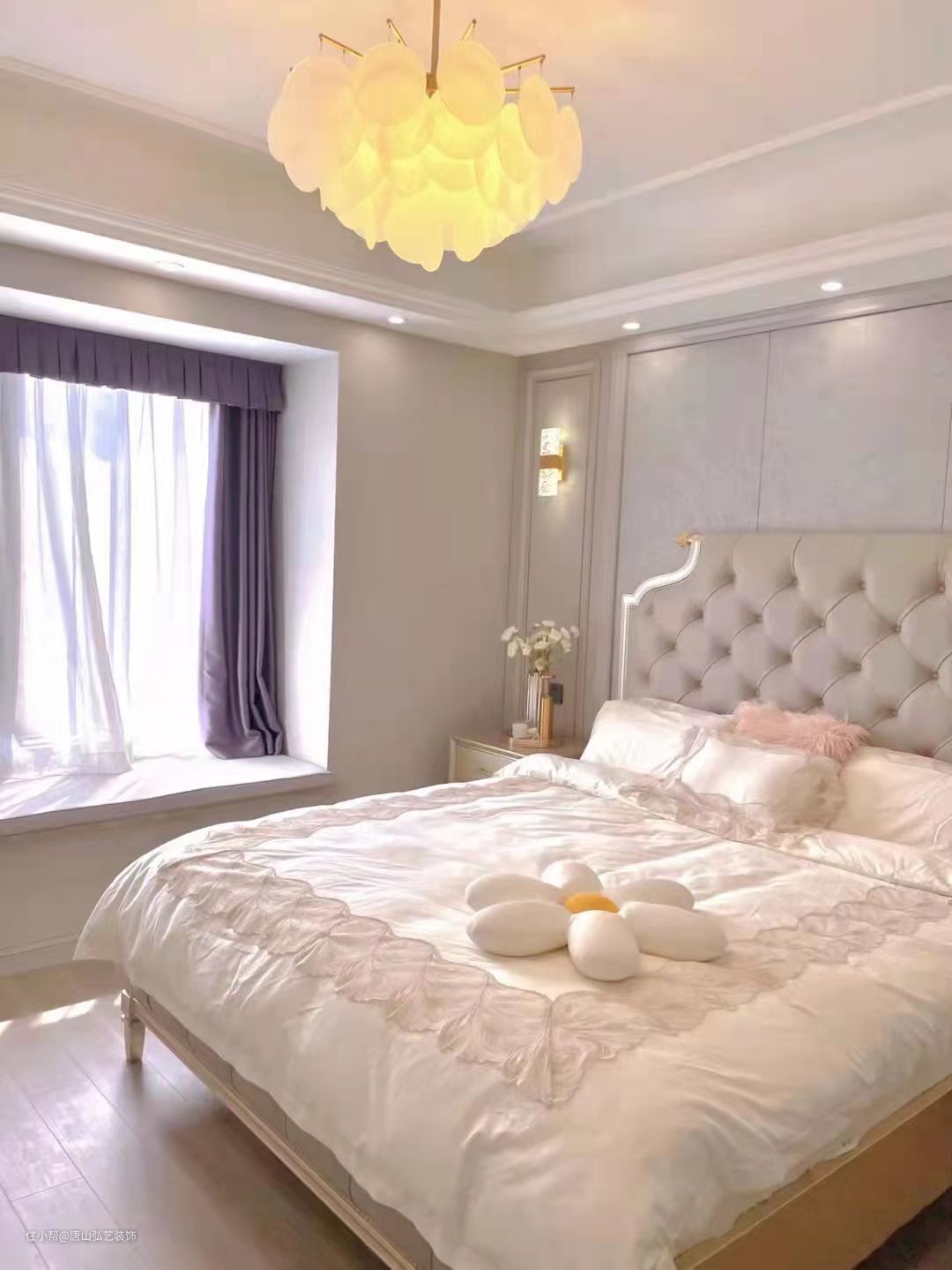 卧室的背景墙才用石膏线边框,非常喜欢这个设计,尤其是床头这个圆形长筒现代床头灯,造型别致,灯源不刺眼,很柔和,拉扣牛皮床搭配纯铜柱头,房间整体色调清爽。