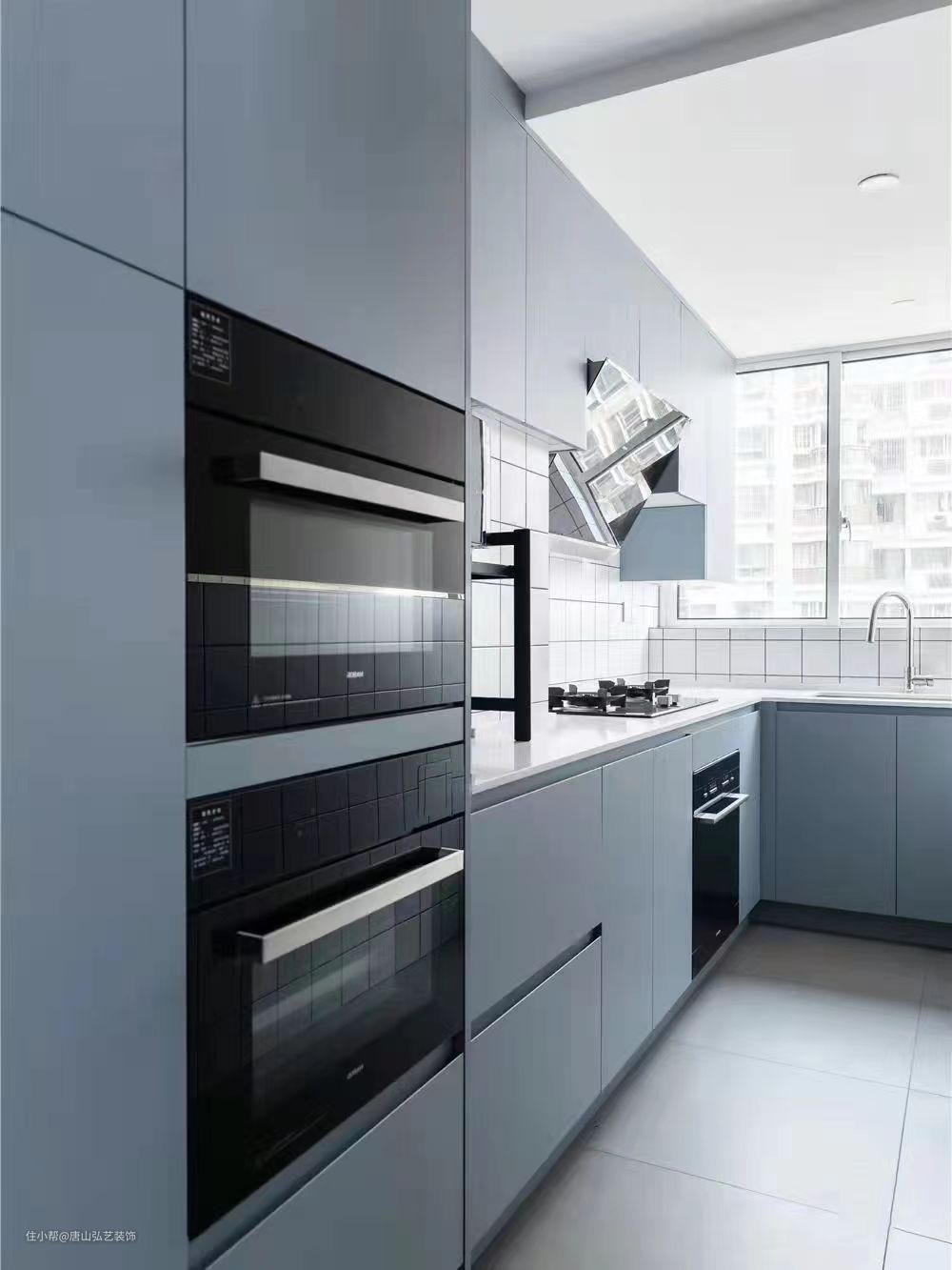 由于厨房比较小,做成L型的橱柜,布局排列简单,节省空间,台面选择了白色,和橱柜门很搭配,橱柜的门把手才用了反弹器,干净也好清理,这个颜色相对来说不显脏,厨房原本有个小阳台,现在也完全打通。整体更加开阔,