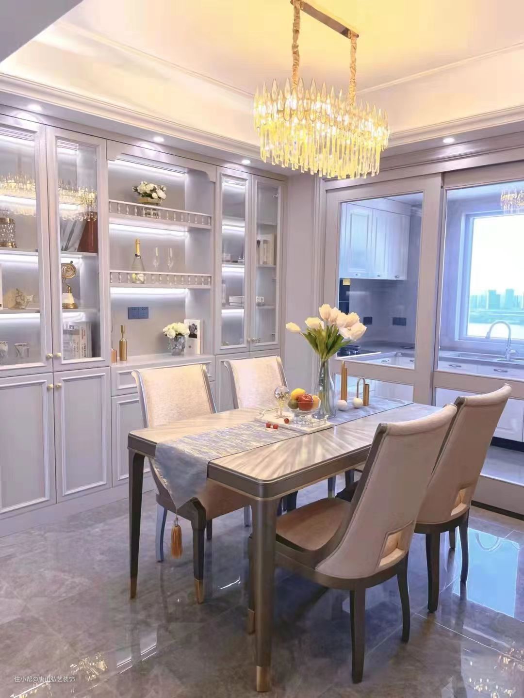 餐厅的定制柜也是才用雾霾蓝色,颜值杠杠的,收纳能力居然也是满分,长方形的餐桌满足了一家四口餐桌搭配上暖黄色灯光,一旁的雾霾蓝酒柜,尽显格调,给你带来家的温暖。