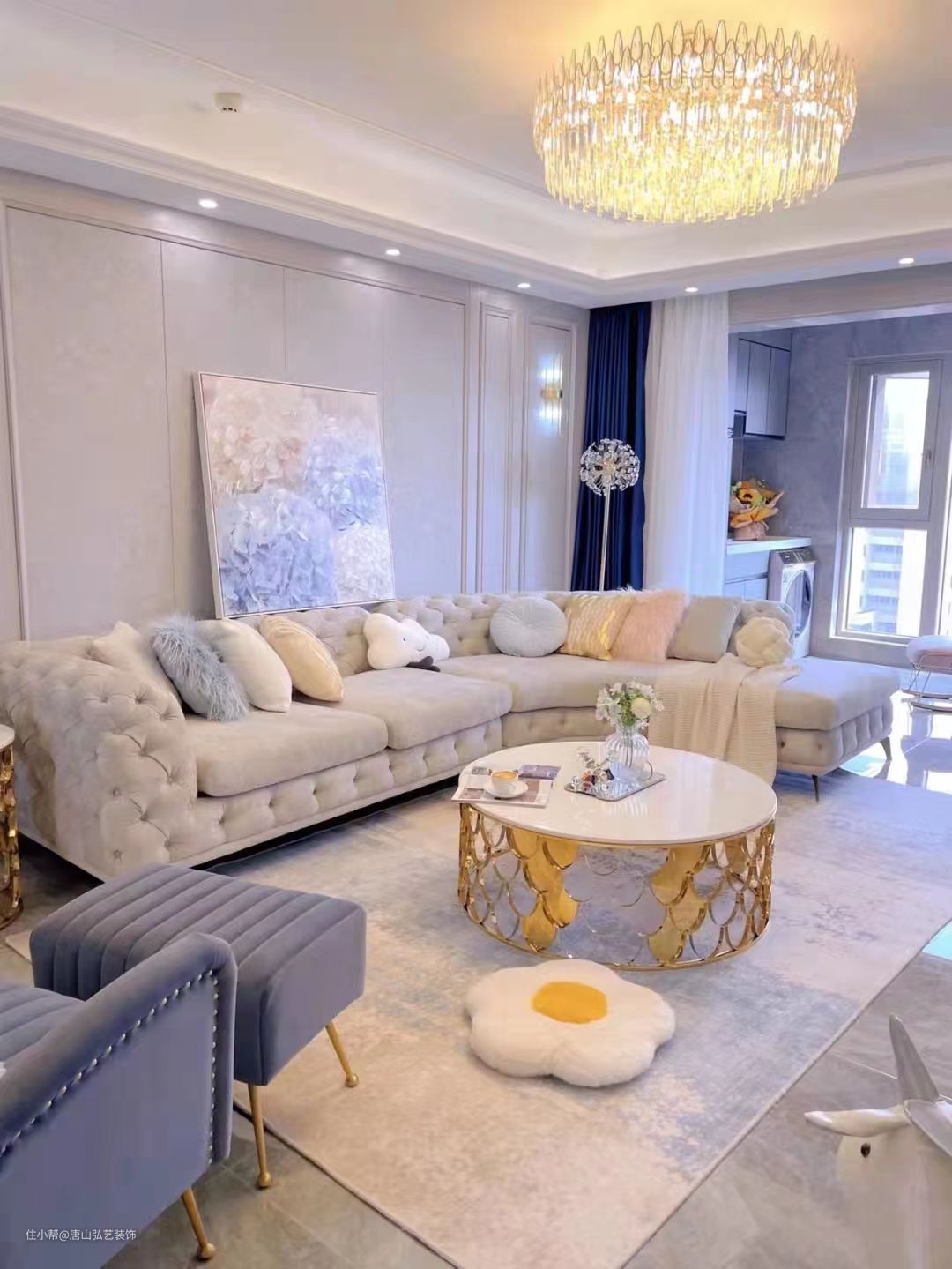 客厅才用的是莫奈灰色系,搭配同样色系的转角拉扣沙发,无论在视觉还是触觉方面都是至高的享受鱼鳞型茶几的金属设计给低调的配色增添了一抹亮点,墙面才用石膏线条作为客厅墙面,整个空间既揉和又有高级感,