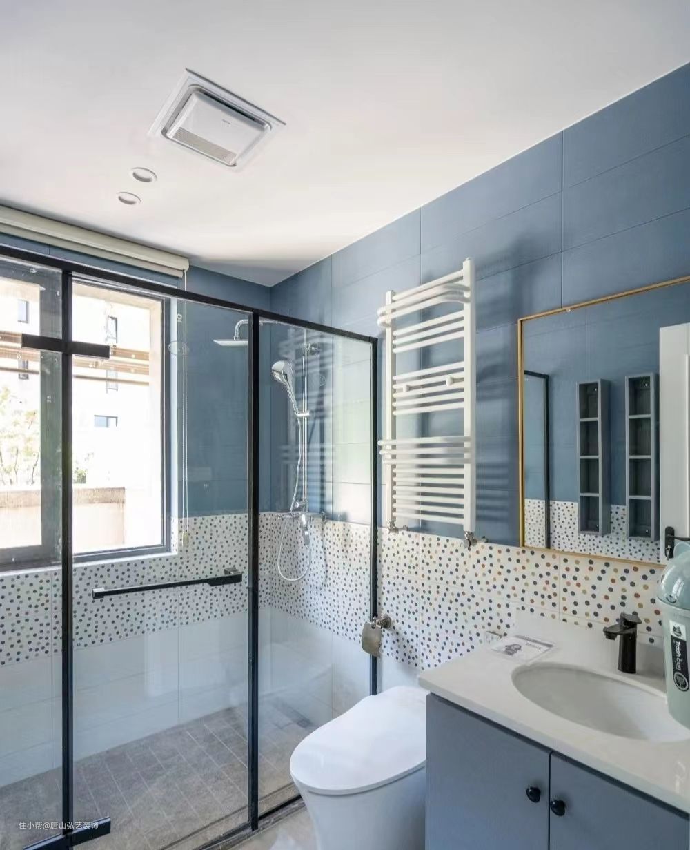 整个空间选得是雾霾蓝,不压抑也不会太亮眼,是防水的乳胶漆所以不怕受潮,地面选择波点瓷砖和雾霾蓝组合起来真的太元气了,淋浴屏进行干湿分离,干区用台盆一体浴室柜来进行收纳。