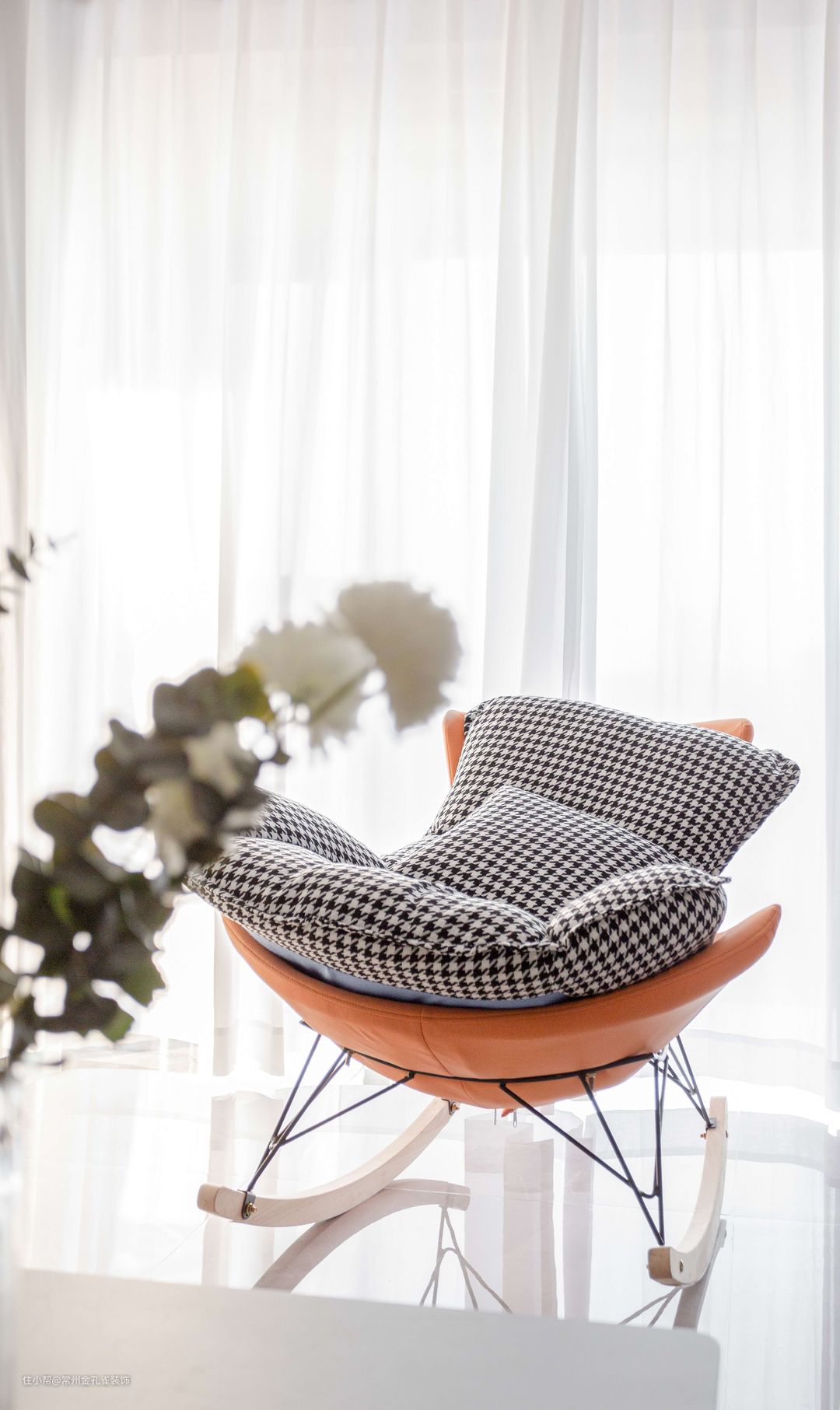 公共空间以灰色艺术涂料奠定空间宁静的基调,米咖色沙发、橘色千鸟格单人沙发丰富着客厅的色彩感知。清透的白纱让光洒进来,光与影交错,时间和空间的互动,为室内增添灵动的魅力。在功能的前提下,让生活多赋予一些人满足于喜悦的东西,让空间成为随时可以与家人沟通交流的地方。