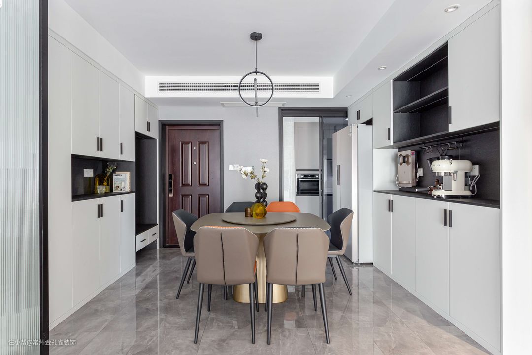 轻奢方形餐桌,深卡其色加黑色餐椅经典的搭配,承接客厅的温润。柜体开敞、半开敞、闭合有节奏的分割,即使是大面积的存在却毫无压迫感。