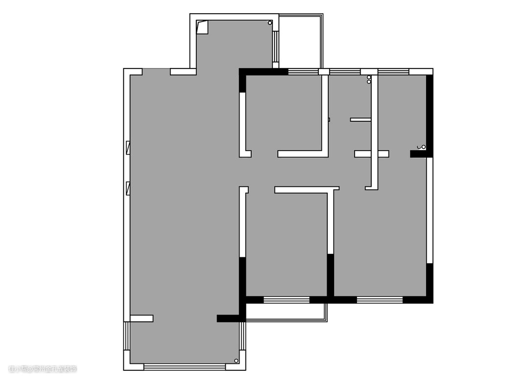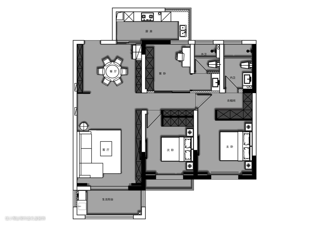 # 原户型 原户型的设计虽说已经比较合理,根据业主需求还是有需要完善的地方。业主由于工作的原因,双方都比较忙,想要省心家里多些储物空间来进行收纳和展示。 # 起居空间 1. 进门右侧设计了一整排鞋柜,增加换鞋凳功能,缓解一天的疲惫感。 2. 餐厅东墙设计一整排的装饰柜,冰箱嵌入装饰柜,释放了厨房的空间。预留除了管线饮水机和咖啡机的位置,闲暇时光泡泡咖啡,还是非常惬意享受的。 3. 客厅利用储物柜做成电视墙,内嵌电视机,保留一定的开放格做成展示区域。整个客餐厅的柜体利用深浅色的撞色设计,既协调整体,又富有层次感。 4.原外卫生间的房门对着主卧的房门,主卫生间的房间直对主卧床,对于观感和风水的问题都进行了优化。现外卫生间做成了干湿分离。 # 睡眠区域 1. 北次卧设计成了全家使用的公用书房,将书房南侧的墙体拆除做成了三联动的移门,增加了采光感和空间感。 2. 将需求之外的小房间一分为二,补充主卧衣帽间及儿童房的学习区域,满足基本常住需求的同时,增加房间的功能性。将原主卧的房门的位置进行调整,进出方便。因此也做出了带有独立内卫及衣帽间的套房,不仅增加了储物空间,私密性也得到保障。