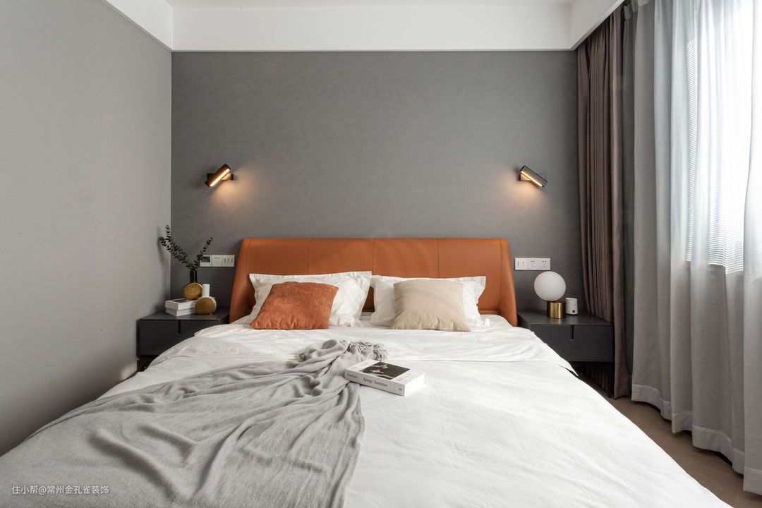 低饱和度不同明度的灰,哑光的墙面颜色,让卧室保持宁静的氛围。棕橘色床体时髦感十足,舒适亲肤的床品、简单大方的装饰,营造空间氛围自由放松。