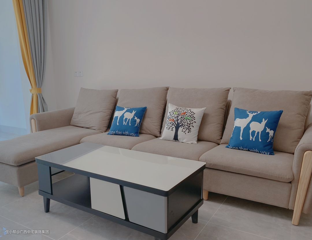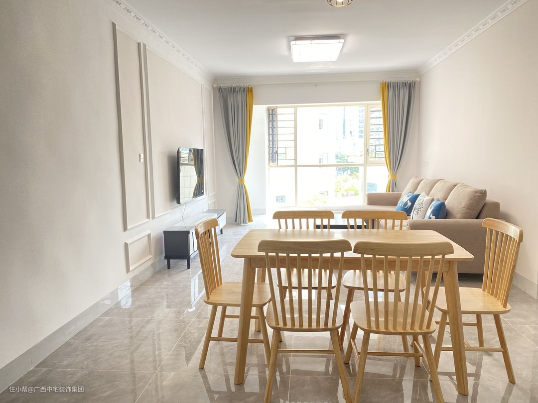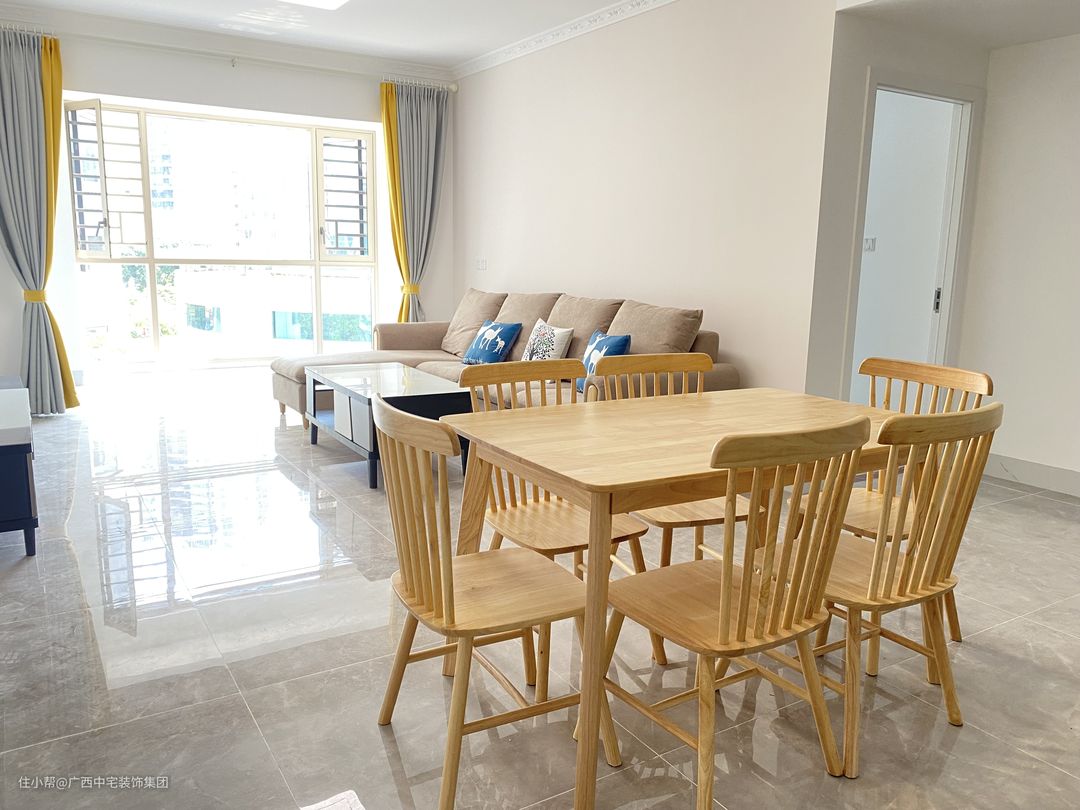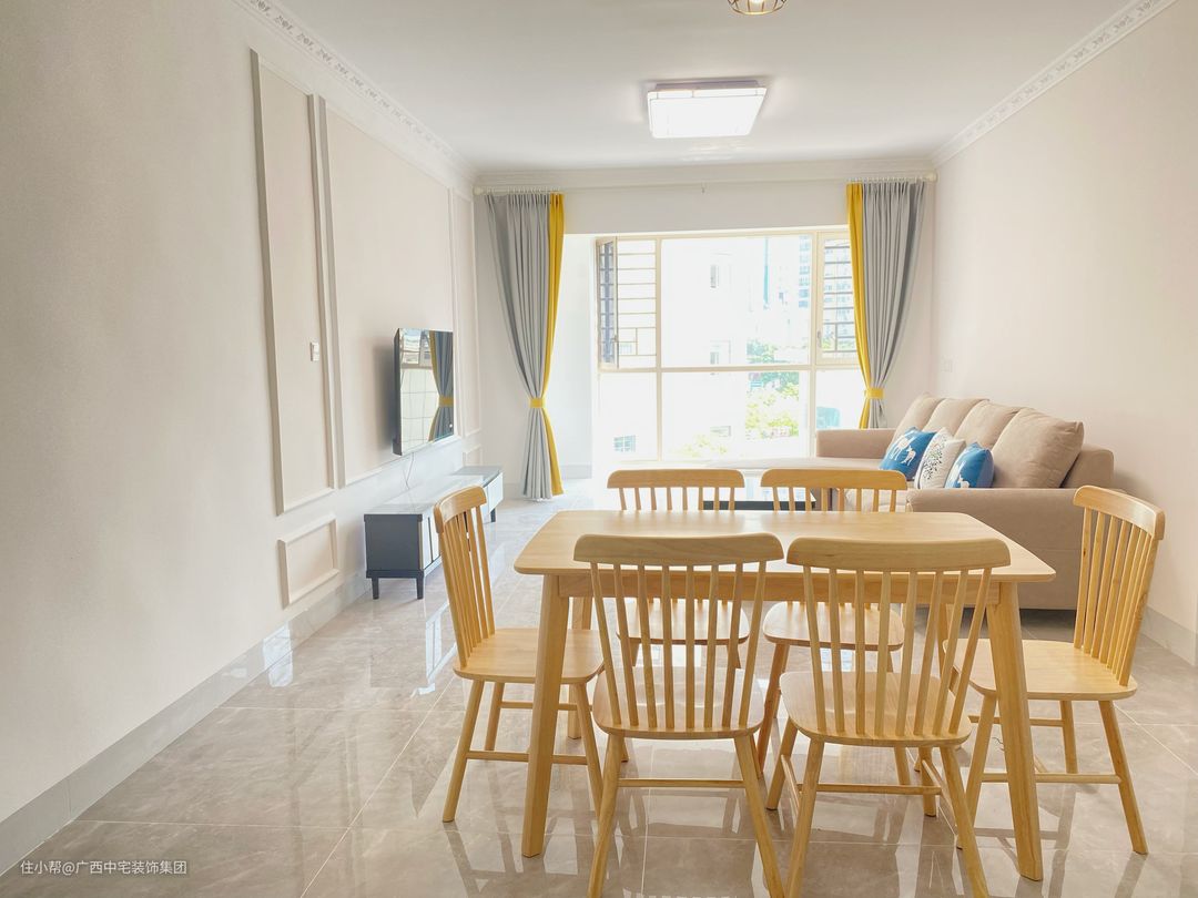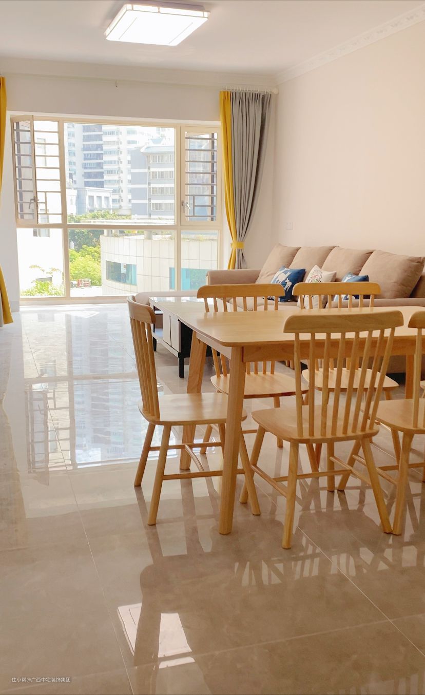 客厅与餐厅连结,视觉上明朗开阔。原木家具与布艺沙发的和谐搭配,零违和感,清新自然之感扑面袭来。