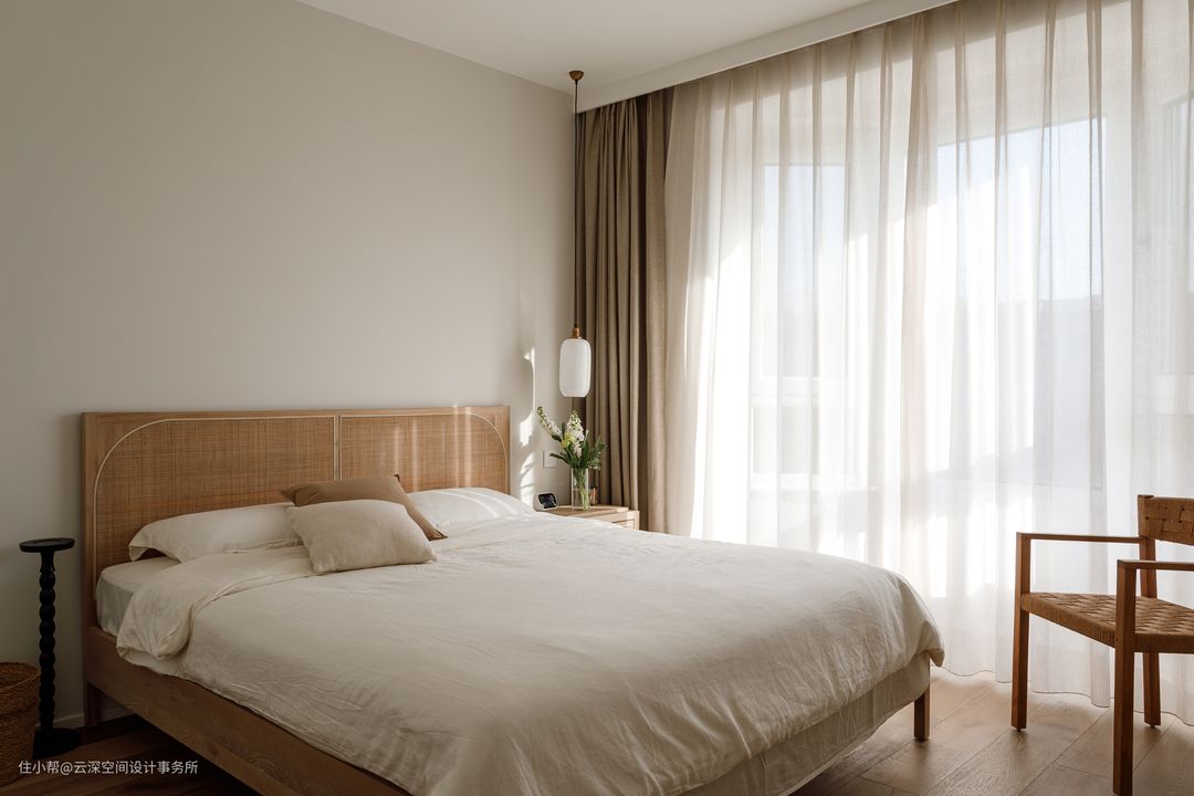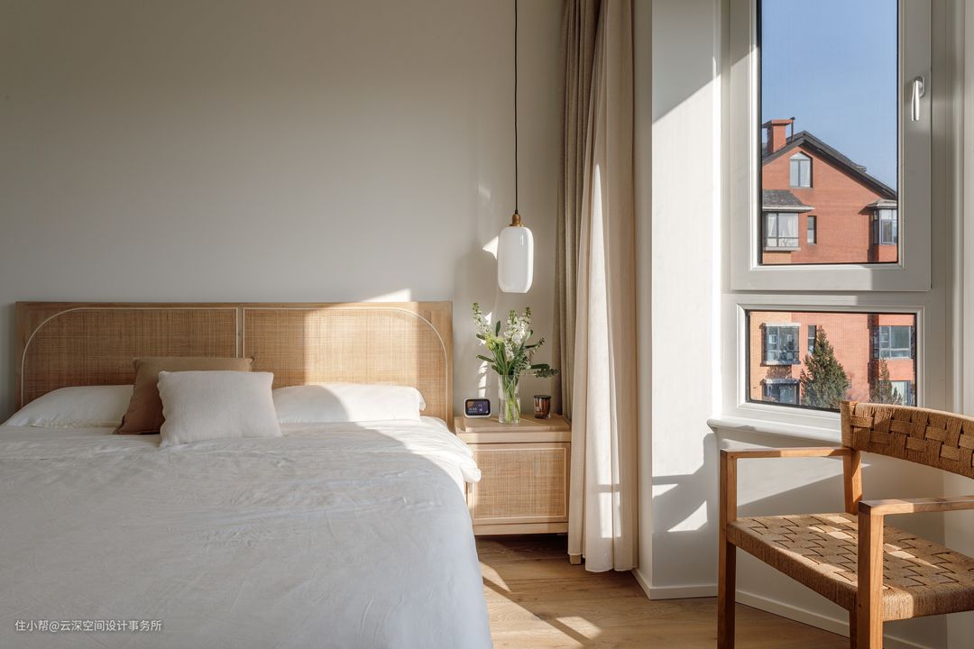 一楼次卧硬装没有过度造型简约、质朴,藤编家具和棉麻的床品搭配,让房间充满自然、原始的氛围; #侘寂风 #卧室 #藤编 #绿植 #软装