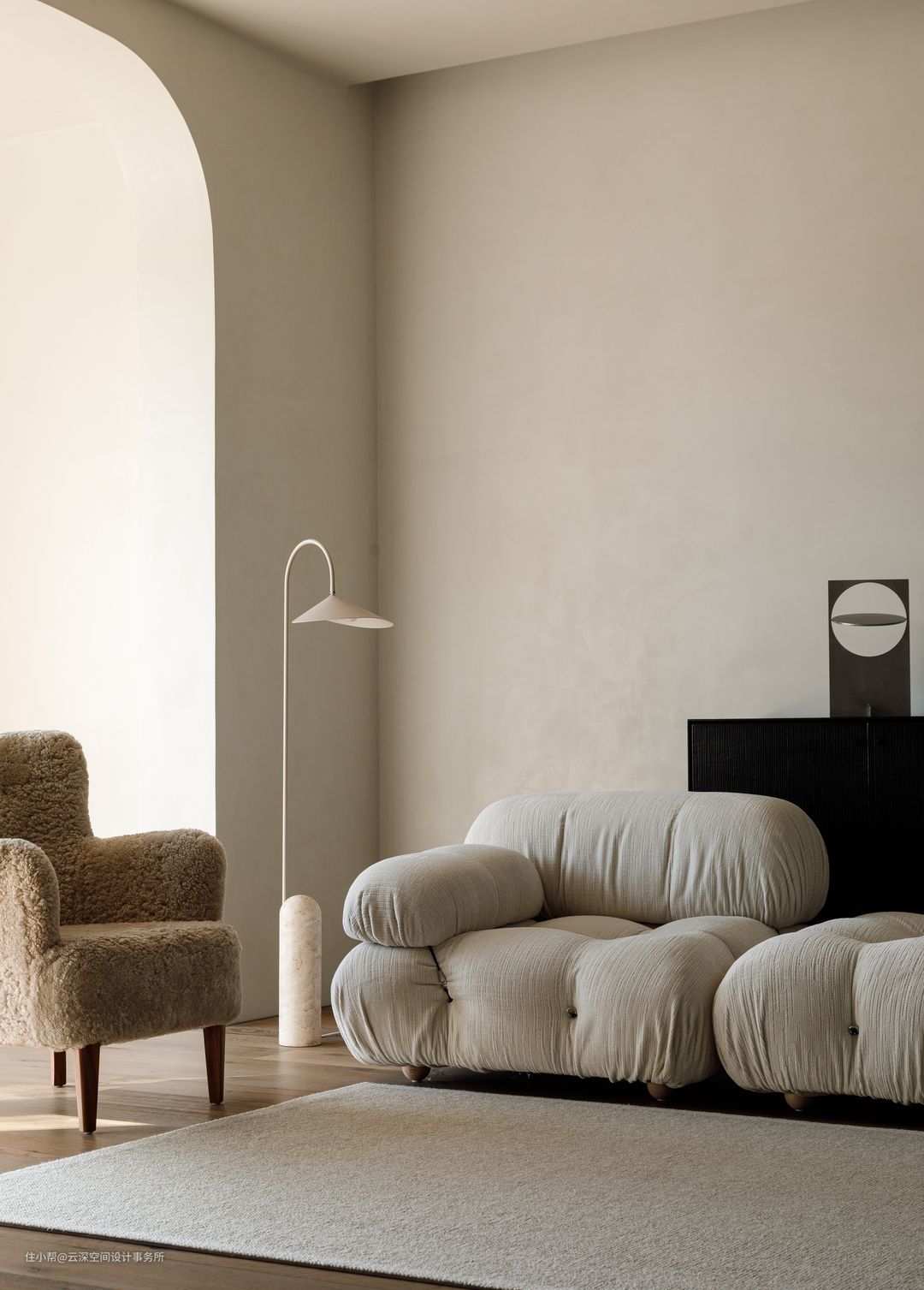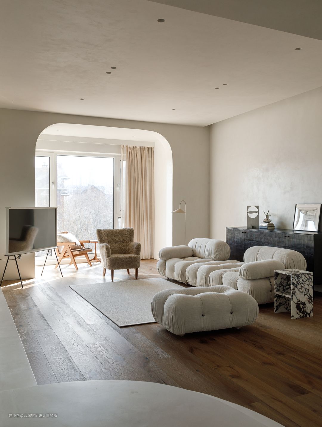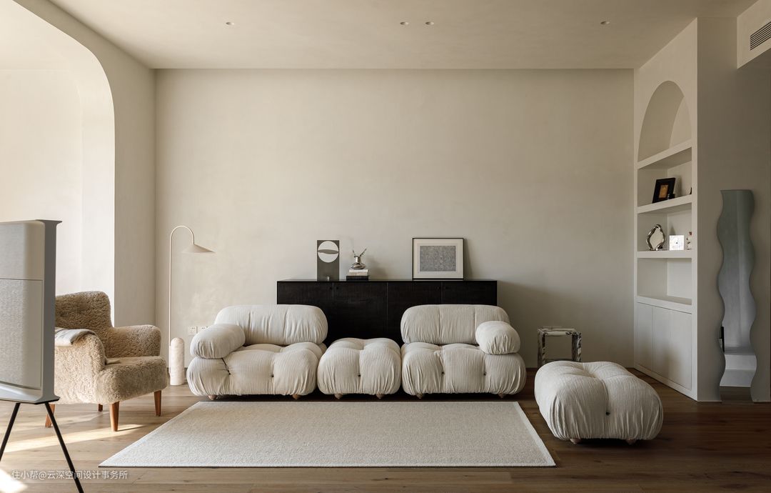 奶油色系的空间,带来舒适的视觉享受;软装搭配以同色系为主色调,羊羔绒的单人沙发和白色系模块沙发组合,搭配黑色边柜,将视觉聚焦;一抹深沉的黑让空间愈发高级; #侘寂风 #奶油风 #客厅 #弧形垭口 #三星画境电视 #客厅边柜 #木地板 #微水泥 #软装 #壁龛
