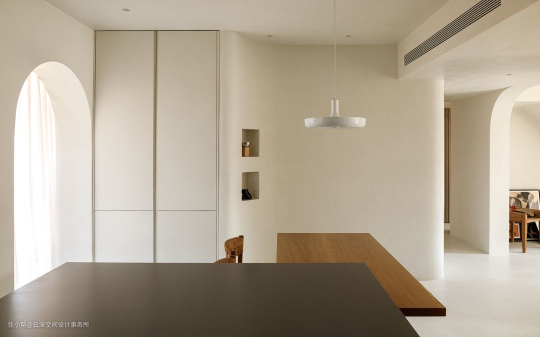 餐厅靠卫生间一层墙面新建弧形造型墙面,弧形墙面浑然天成的两处壁龛,随意放置的精美器皿,简而精致; #侘寂风 #LDK一体化 #微水泥 #弧形造型 #中央空调 #壁龛 #软装 #中岛台 #开放式厨房 #嵌入式冰箱